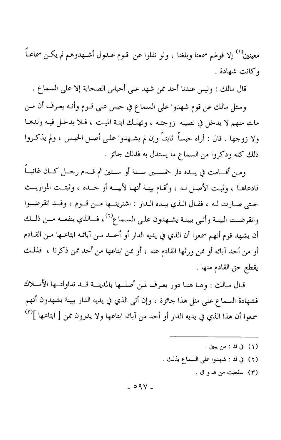 3291 - وسئل مالك عن قوم شهدوا على السماع في حبس على قوم وأنه يعرف أن من مات منهم لا يدخل في نصيبه زوجته، وتهلك ابنة الميت، فلا يدخل فيه ولدها ولا زوجها. قال: أراه حبساً ثابتاً وإن لم يشهدوا على أصل الحبس، ولم يذكروا ذلك كله وذكروا من السماع ما يستدل به فذلك جائز.