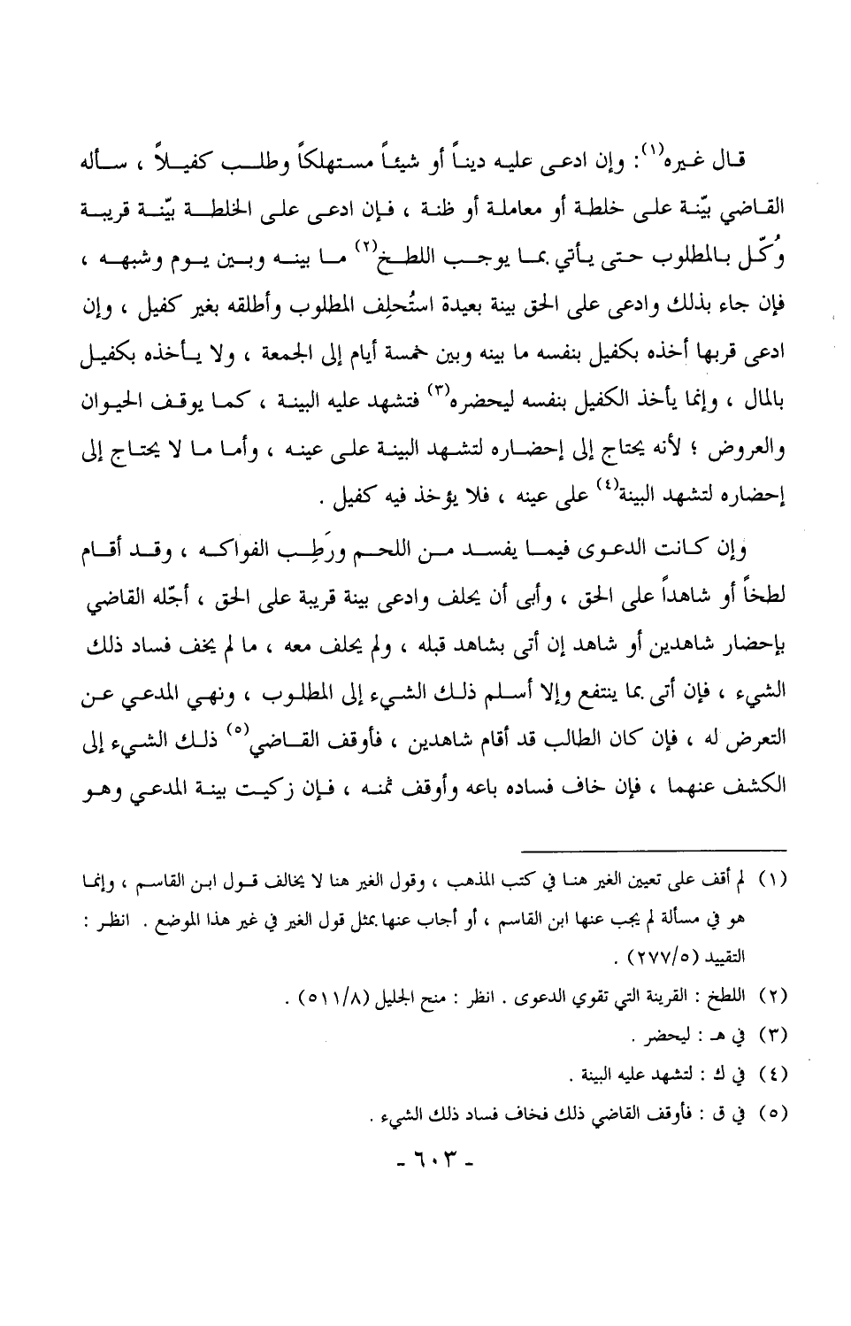 قال غيره: وإن ادعى عليه ديناً أو شيئاً مستهلكاً وطلب كفيلاً، سأله القاضي بيّنة على خلطة أو معاملة أو ظنة، فإن ادعى على الخلطة بيّنة قريبة وُكّل بالمطلوب حتى يأتي بما يوجب اللطخ ما بينه وبين يوم وشبهه، فإن جاء بذلك وادعى على الحق بينة بعيدة استُحلِف المطلوب وأطلقه بغير كفيل، وإن ادعى قربها أخذه بكفيل بنفسه ما بينه وبين خمسة أيام إلى الجمعة، ولا يأخذه بكفيل بالمال، وإنما يأخذ الكفيل بنفسه ليحضره فتشهد عليه البينة، كما يوقف الحيوان والعروض، لأنه يحتاج إلى إحضاره لتشهد البينة على عينه، وأما ما لا يحتاج إلى إحضاره لتشهد البينة على عينه، فلا يؤخذ فيه كفيل. (¬1)