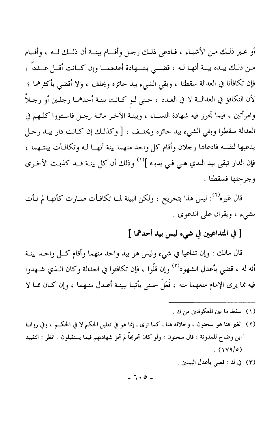أو غير ذلك من الأشياء، فادعى ذلك رجل وأقام بينة أن ذلك له، وأقام من ذلك بيده بينة أنها له، قضي بشهادة أعدلهما وإن كانت أقل عدداً، فإن تكافأتا في العدالة سقطتا، وبقي الشيء بيد حائزه ويحلف، ولا أقضي بأكثرهما، لأن التكافؤ في العدالة لا في العدد، حتى لو كانت بينة أحدهما رجلين أو رجلاً وامرأتين، فيما تجوز فيه شهادة النساء، وبينة الآخر مائة رجل فاستووا كلهم في العدالة سقطوا وبقي الشيء بيد حائزه ويحلف، [وكذلك إن كانت دار بيد رجل يدعيها لنفسه فادعاها رجلان وأقام كل واحد منهما بينة أنها له وتكافأت بينتهما، فإن الدار تبقى بيد الذي هي في يديه] وذلك أن كل بينة قد كذبت الأخرى وجرحتها فسقطتا.