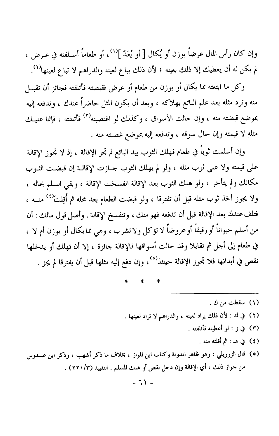 2438 - وإن أسلمت ثوباً في طعام فهلك الثوب بيد البائع لم يجز الإقالة، إذ لا تجوز الإقالة على قيمته ولا على ثوب مثله، ولو لم يهلك الثوب جازت الإقالة إن قبضت الثوب مكانك ولم يتأخر، ولو هلك الثوب بعد الإقالة انفسخت الإقالة، وبقي السلم بحاله، ولا يجوز أخذ ثوب مثله قبل أن تفترقا، ولو قبضت الطعام بعد محله ثم أُقِلت منه، فتلف عندك بعد الإقالة قبل أن تدفعه فهو منك، وتنفسخ الإقالة. وأصل قول مالك: أن من أسلم حيواناً أو رقيقاً أو عروضاً لا تؤكل ولا تشرب، وهي مما يكال أو يوزن أم لا، في طعام إلى أجل ثم تقايلا وقد حالت أسواقها فالإقالة جائزة، إلا أن تهلك أو يدخلها نقص في أبدانها فلا تجوز الإقالة حينئذ، وإن دفع إليه مثلها قبل أن يفترقا لم يجز. (¬1)