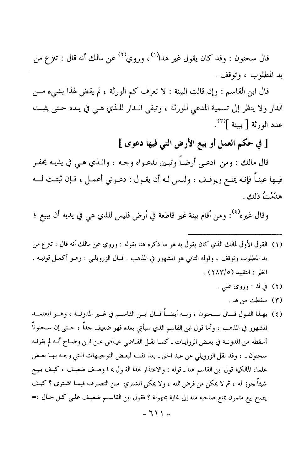 3312 - قال مالك: ومن ادعى أرضاً وتبين لدعواه وجه، والذي هي في يديه يحفر فيها عيناً فإنه يمنع ويوقف، وليس له أن يقول: دعوني أعمل، فإن ثبتت له هدَمْت ذلك.