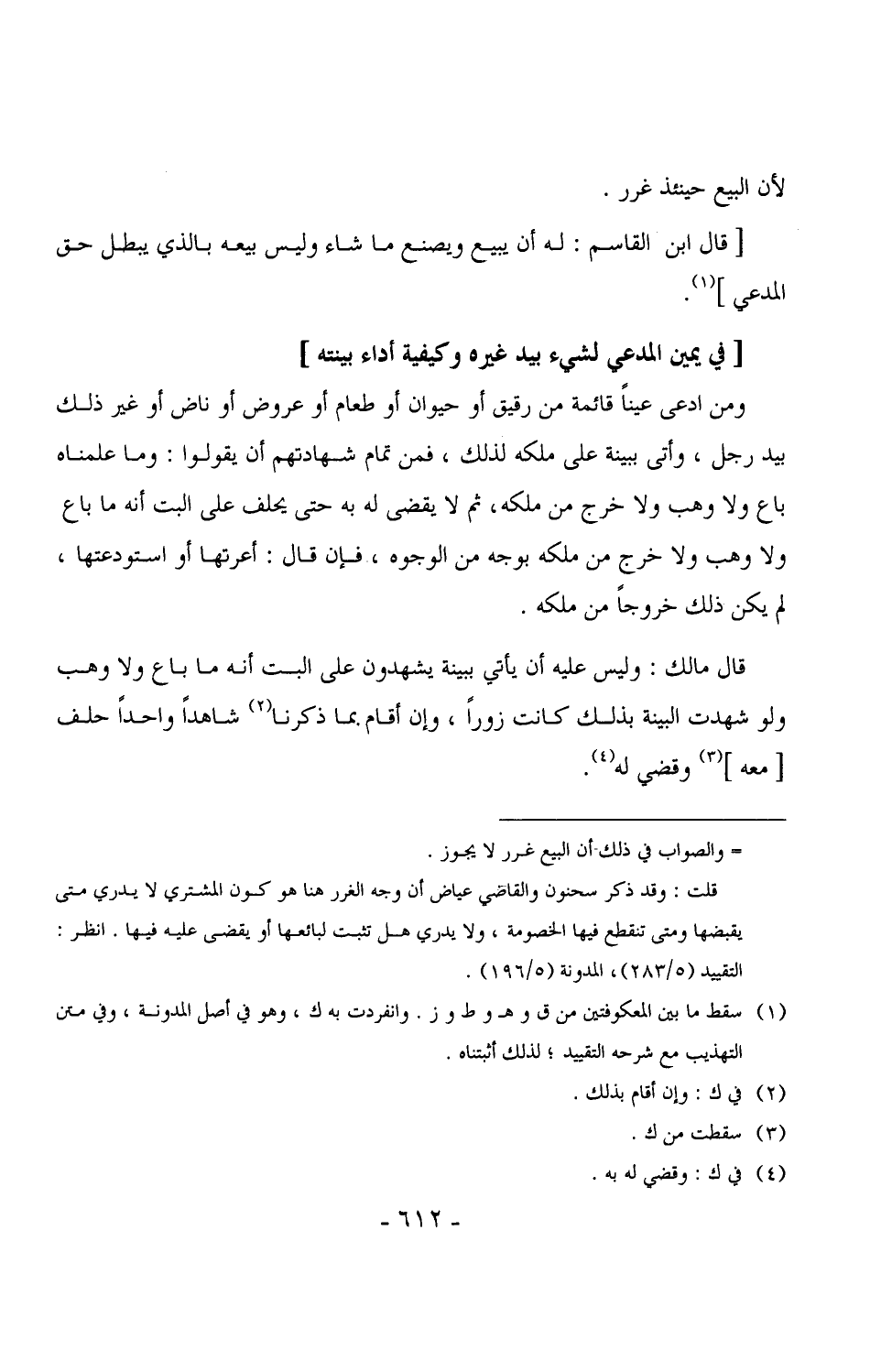 3313 - ومن ادعى عيناً قائمة من رقيق أو حيوان أو طعام أو عروض أو ناض أو غير ذلك بيد رجل، وأتى ببينة على ملكه لذلك، فمن تمام شهادتهم أن يقولوا: وما علمناه باع ولا وهب ولا خرج من ملكه، ثم لا يقضى له به حتى يحلف على البت أنه ما باع، ولا وهب ولا خرج من ملكه بوجه من الوجوه، فإن قال: أعرتها أو استودعتها، لم يكن ذلك خروجاً من ملكه.