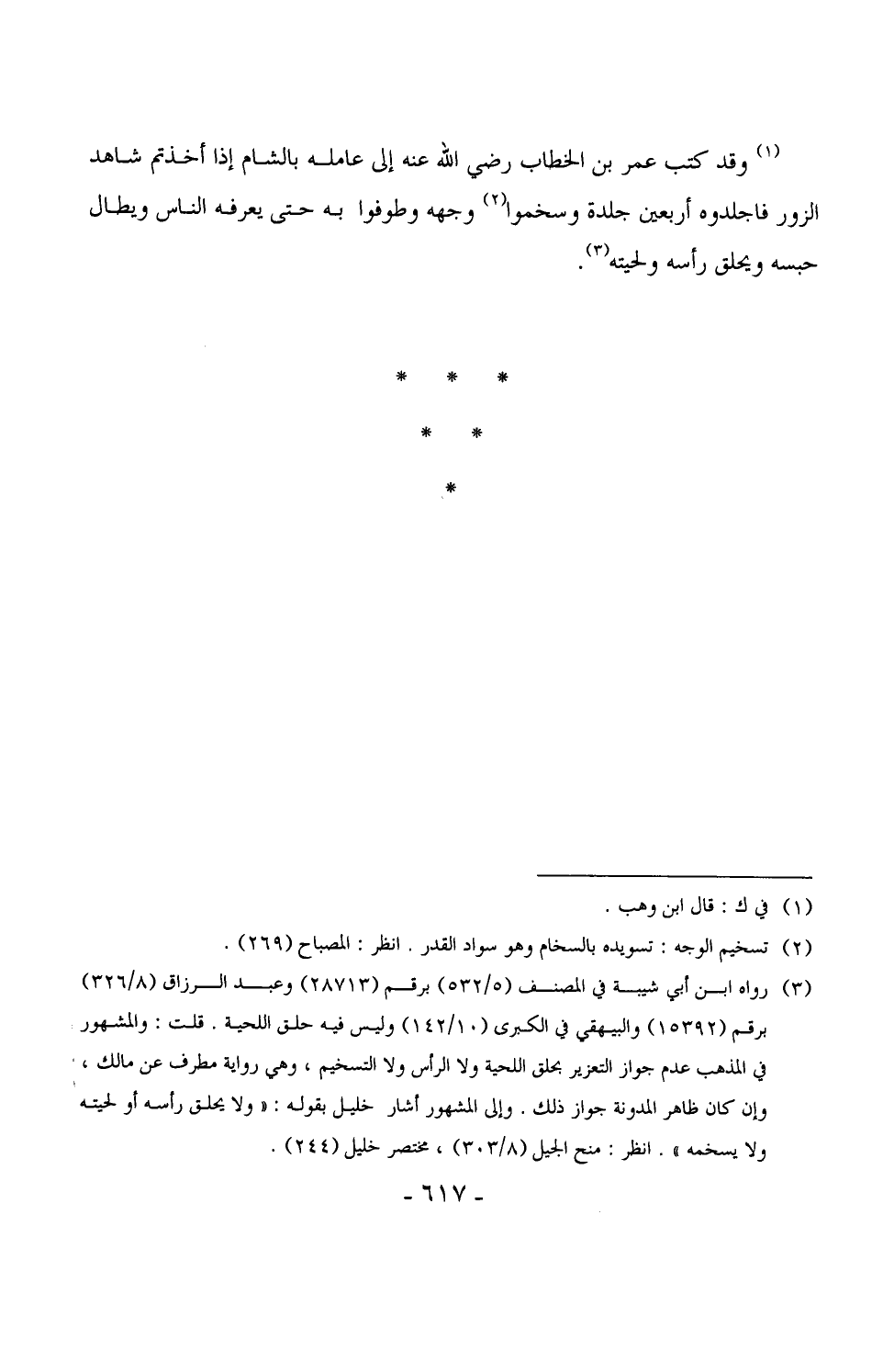 3324 - وقد كتب عمر بن الخطاب رضي الله عنه إلى عامله بالشام إذا أخذتم شاهد الزور فاجلدوه أربعين جلدة وسخموا وجهه وطوفوا به حتى يعرفه الناس ويطال حبسه ويحلق رأسه ولحيته. (¬1)