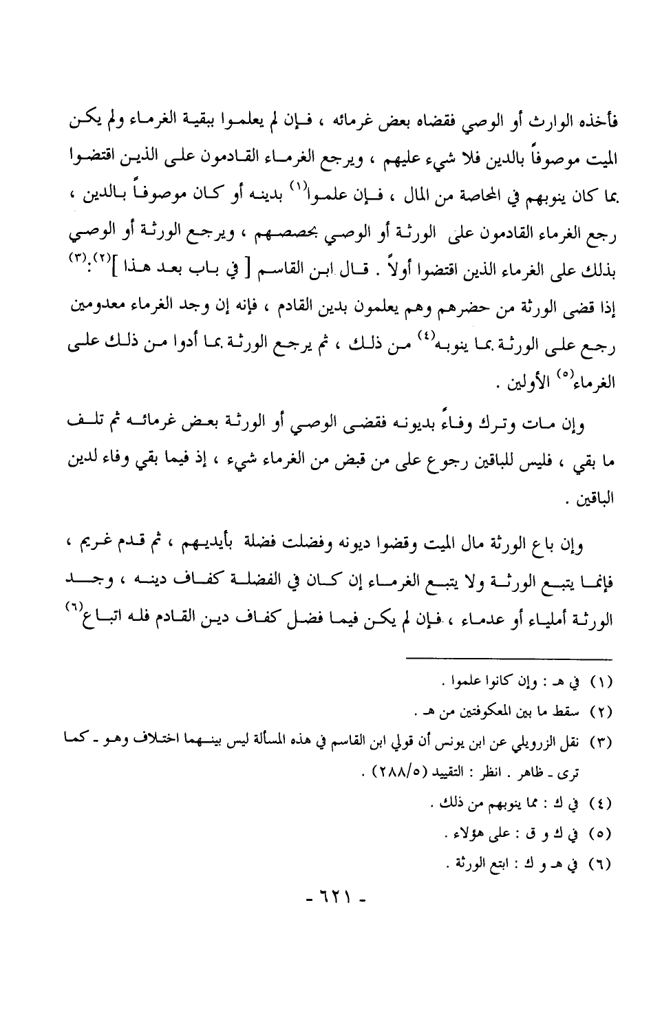 3328 - وإن باع الورثة مال الميت وقضوا ديونه وفضلت فضلة بأيديهم، ثم قدم غريم، فإنما يتبع الورثة ولا يتبع الغرماء إن كان في الفضلة كفاف دينه، وجد الورثة أملياء أو عدماء، فإن لم يكن فيما فضل كفاف دين القادم فله اتباع