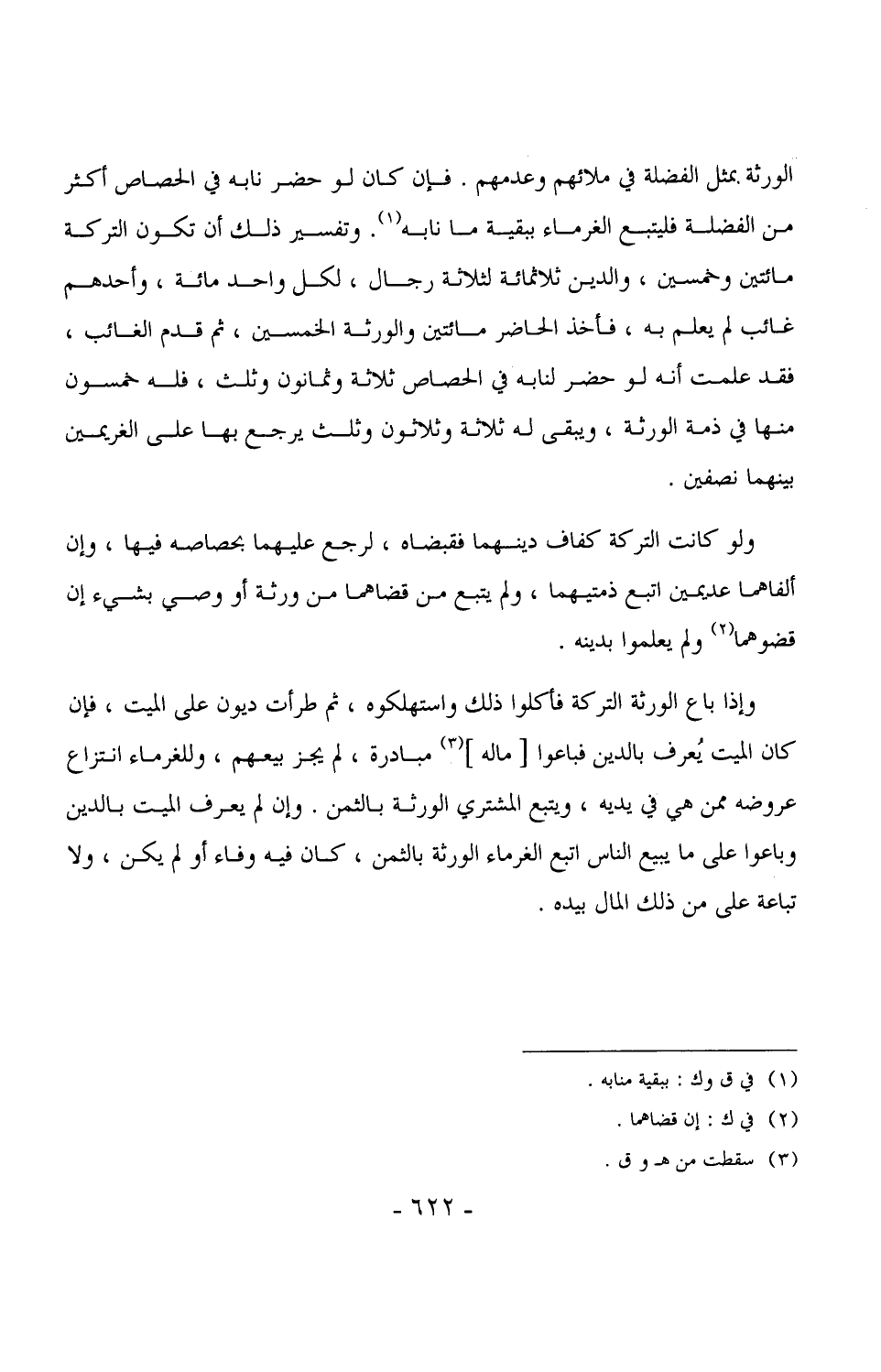 الورثة بمثل الفضلة في ملائهم وعدمهم. فإن كان لو حضر نابه في الحصاص أكثر من الفضلة فليتبع الغرماء ببقية ما نابه. وتفسير ذلك أن تكون التركة مائتين وخمسين، والدين ثلاثمائة لثلاثة رجال، لكل واحد مائة، وأحدهم غائب لم يعلم به، فأخذ الحاضر مائتين والورثة الخمسين، ثم قدم الغائب، فقد علمت أنه لو حضر لنابه في الحصاص ثلاثة وثمانون وثلث، فله خمسون منها في ذمة الورثة، ويبقى له ثلاثة وثلاثون وثلث يرجع بها على الغريمين بينهما نصفين.
