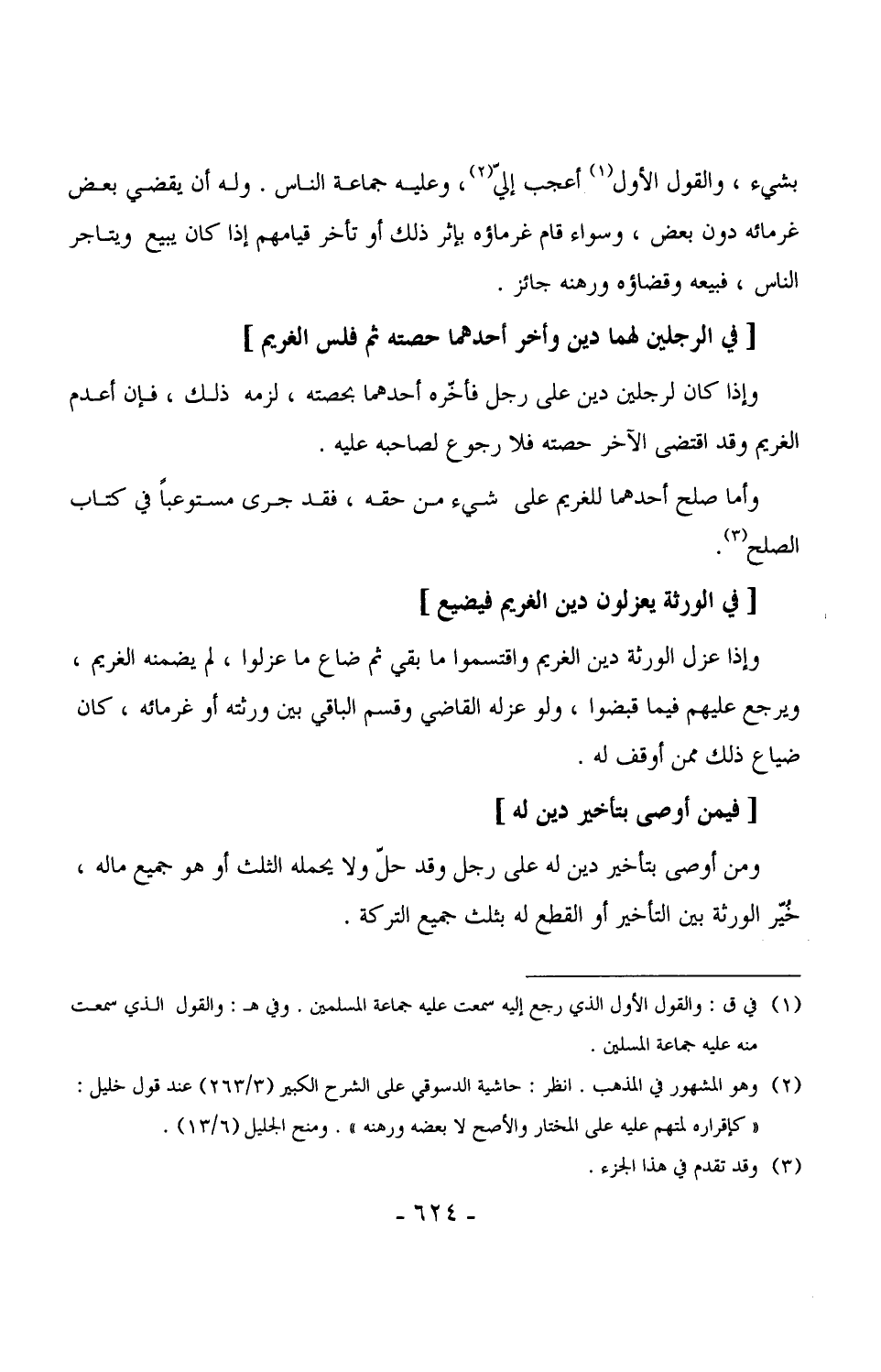 3331 - وإذا عزل الورثة دين الغريم واقتسموا ما بقي ثم ضاع ما عزلوا، لم يضمنه الغريم، ويرجع عليهم فيما قبضوا، ولو عزله القاضي وقسم الباقي بين ورثته أو غرمائه، كان ضياع ذلك ممن أوقف له.