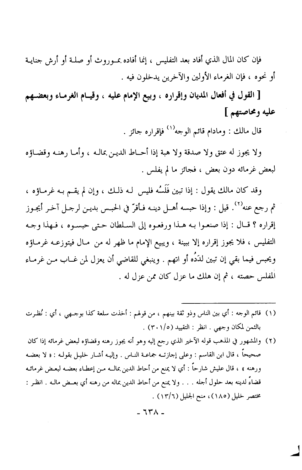 3356 - قال مالك: وما دام قائم الوجه فإقراره جائز. ولا يجوز له عتق ولا صدقة ولا هبة إذا أحاط الدين بماله، وأما رهنه وقضاؤه لبعض غرمائه دون بعض، فجائز ما لم يفلس.