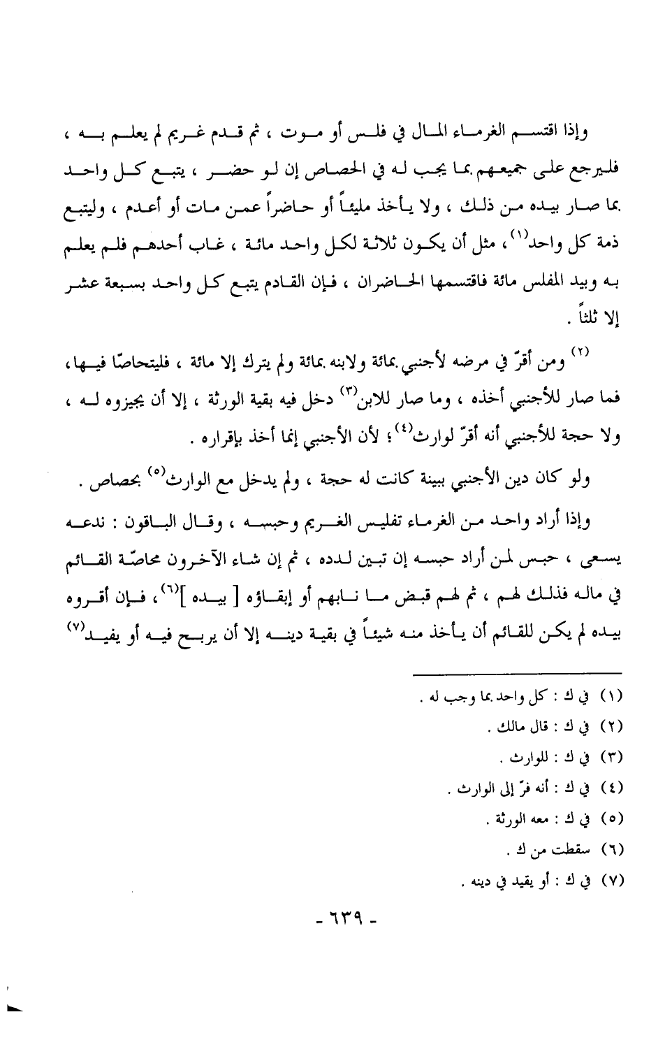 3357 - وإذا اقتسم الغرماء المال في فلس أو موت، ثم قدم غريم لم يعلم به، فليرجع على جميعهم بما يجب له في الحصاص إن لو حضر، يتبع كل واحد بما صار بيده من ذلك، ولا يأخذ مليئاً أو حاضراً عمن مات أو أعدم، وليتبع ذمة كل واحد، مثل أن يكون ثلاثة لكل واحد مائة، غاب أحدهم فلم يعلم به وبيد المفلس مائة فاقتسمها الحاضران، فإن القادم يتبع كل واحد بسبعة عشر إلا ثلثاً.