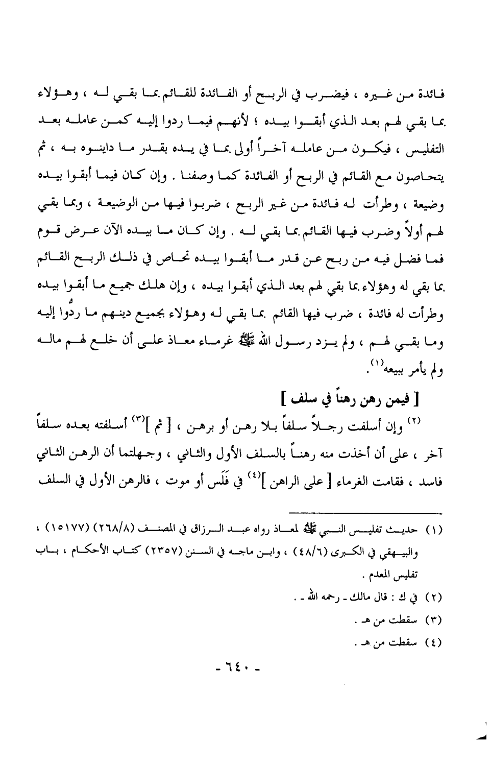 3360 - وإن أسلفت رجلاً سلفاً بلا رهن أو برهن، [ثم] أسلفته بعده سلفاً آخر، على أن أخذت منه رهناً بالسلف الأول والثاني، وجهلتما أن الرهن الثاني فاسد، فقامت الغرماء [على الراهن] في فَلَس أو موت، فالرهن الأول في السلف