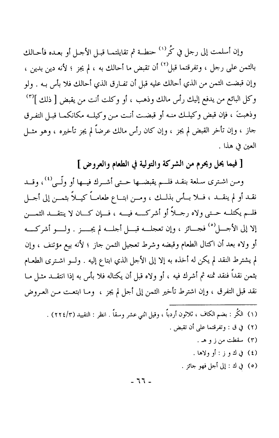 2448 - ومن اشترى سلعة بنقد فلم يقبضها حتى أشرك فيها أو ولى، وقد نقد أو لم ينقد، فلا بأس بذلك، ومن ابتاع طعاماً كيلاً بثمن إلى أجل فلم يكتله حتى ولاه رجلاً أو أشركه فيه، فإن كان لا ينتقد الثمن إلا إلى أجل فجائز، وإن تعجله قبل أجله لم يجز. ولو أشركه أو ولاه بعد أن اكتال الطعام وقبضه وشرط تعجيل الثمن جاز، لأنه بيع مؤتنف، وإن لم يشترط النقد لم يكن له أخذه به إلا إلى الأجل الذي ابتاع إليه. ولو اشترى الطعام بثمن نقداً فنقد ثمنه ثم أشرك فيه، أو ولاه قبل أن يكتاله فلا بأس به إذا انتقد مثل ما نقد قبل التفرق، وإن اشترط تأخير الثمن إلى أجل لم يجز، وما ابتعت من العروض