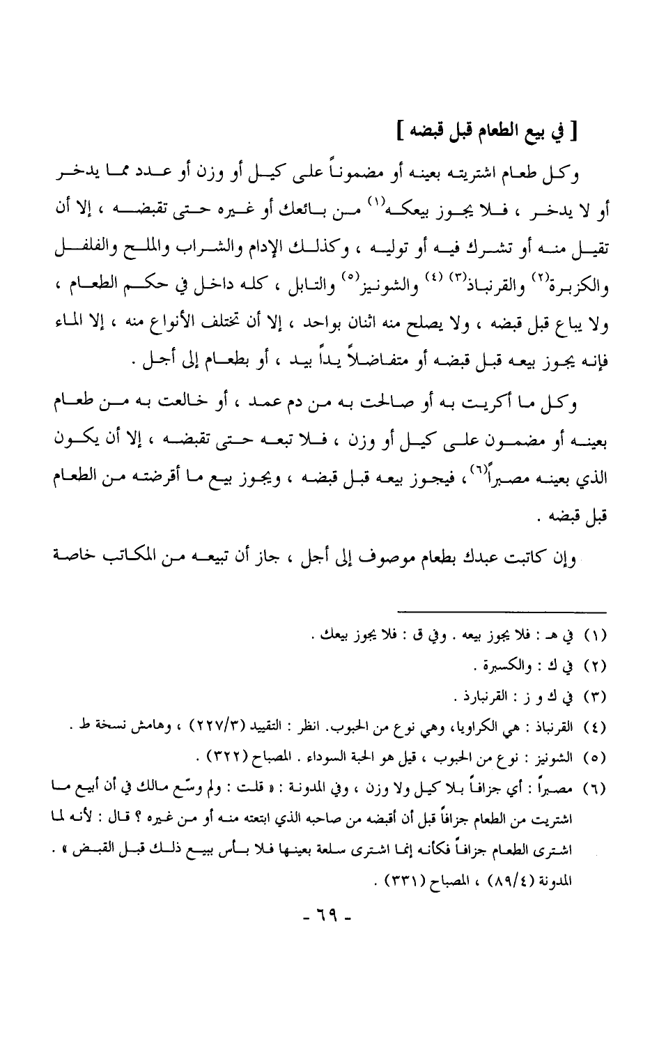 2454 - وكل طعام اشتريته بعينه أو مضموناً على كيل أو وزن أو عدد مما يدخر أو لا يدخر، فلا يجو بيعكه من بائعك أو غيره حتى تقبضه، إلا أن تقيل منه أو تشرك فيه أو توليه، وكذلك الإدام والشراب والملح والفلفل والكزبرة والقرنباذ والشونيز والتابل، كله داخل في حكم الطعام، ولا يباع قبل قبضه، ولا يصلح منه اثنان بواحد، إلا أن تختلف الأنواع منه، إلا الماء فإنه يجوز بيعه قبل قبضه أو متفاضلاً يداً بيد، أو بطعام إلى أجل.