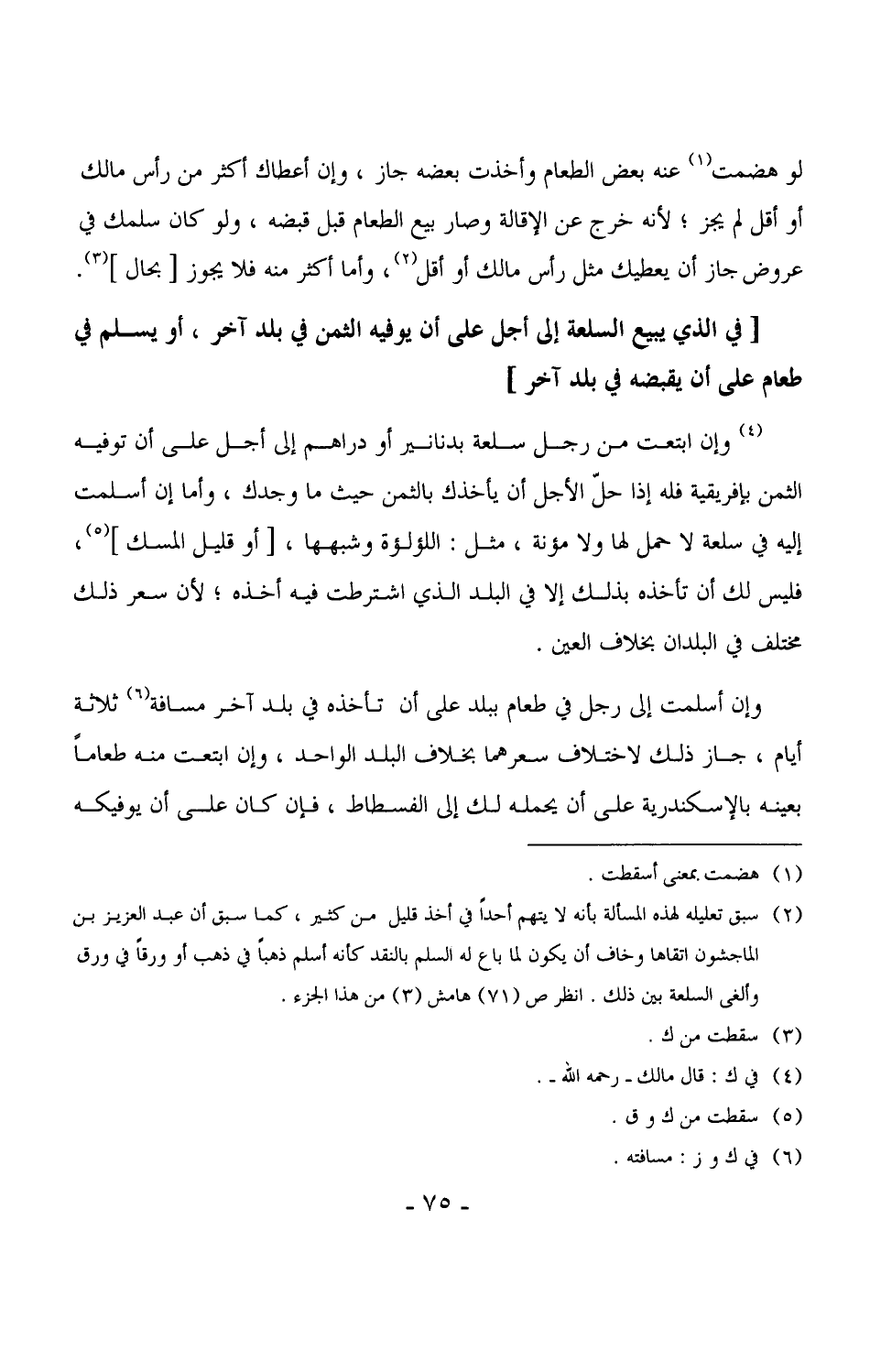 2465 - وإن ابتعت من رجل سلعة بدنانير أو دراهم إلى أجل على أن توفيه الثمن بإفريقية فله إذا حلّ الأجل أن يأخذك بالثمن حيث ما وجدك، وأما إن أسلمت إليه في سلعة لا حمل لها ولا مؤنة، مثل: اللؤلؤة وشبهها، [أو قليل المسك] ، فليس لك أن تأخذه بذلك إلا في البلد الذي اشترطت فيه أخذه، لأن سعر ذلك مختلف في البلدان بخلاف العين.