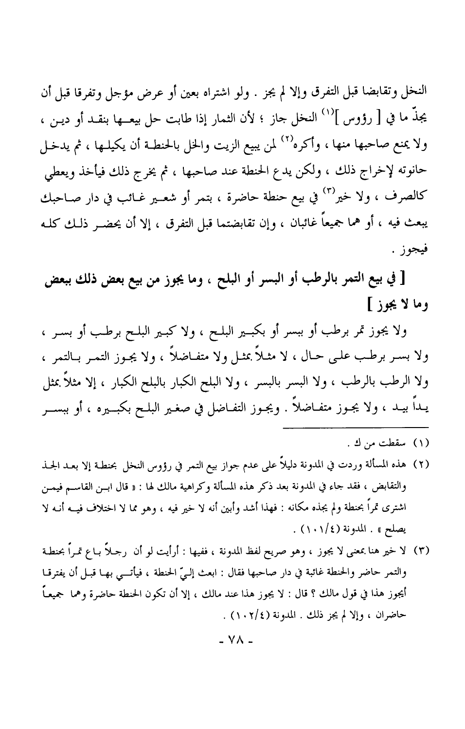 النخل وتقابضا قبل التفرق وإلا لم يجز. ولو اشتراه بعين أو عرض مؤجل وتفرقا قبل أن يجذّ ما في [رؤوس] النخل جاز، لأن الثمار إذا طابت حل بيعها بنقد أو دين، ولا يمنع صاحبها منها، وأكره لمن يبيع الزيت والخل بالحنطة أن يكيلها، ثم يدخل حانوته لإخراج ذلك، ولكن يدع الحنطة عند صاحبها، ثم يخرج ذلك فيأخذ ويعطي كالصرف، ولا خير في بيع حنطة حاضرة، بتمر أو شعير غائب في دار صاحبك يبعث فيه، أو هما جميعاً غائبان، وإن تقابضتما قبل التفرق، إلا أن يحضر ذلك كله فيجوز.