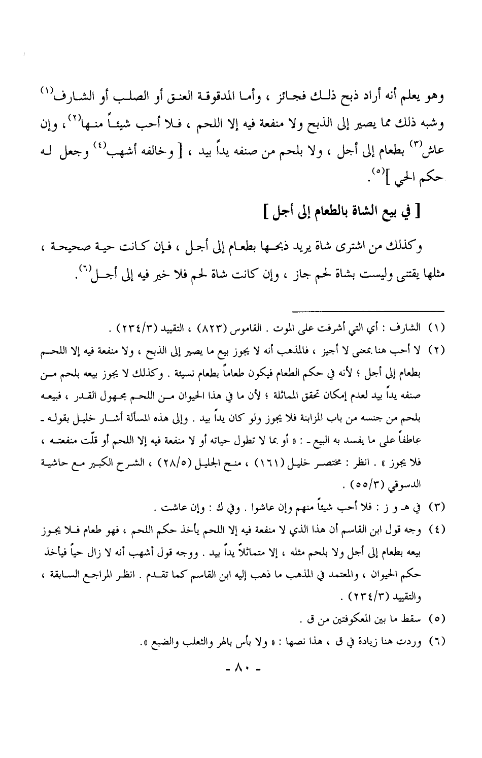 وهو يعلم أنه أراد ذبح ذلك فجائز، وأما المدقوقة العنق أو الصلب أو الشارف وشبه ذلك مما يصير إلى الذبح ولا منفعة فيه إلا اللحم، فلا أحب شيئاً منها، وإن عاش بطعام إلى أجل، ولا بلحم من صنفه يداً بيد، [وخالفه أشهب وجعل له حكم الحي] .