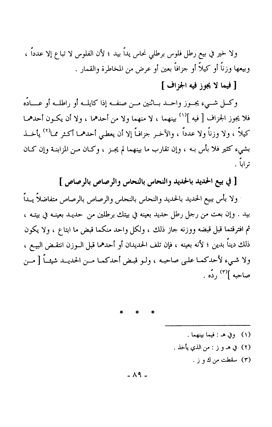 ولا خير في بيع رطل فلوس برطلي نحاس يداً بيد، لأن الفلوس لا تباع إلا عدداً، وبيعها وزناً أو كيلاً أو جزافاً بعين أو عرض من المخاطرة والقمار.