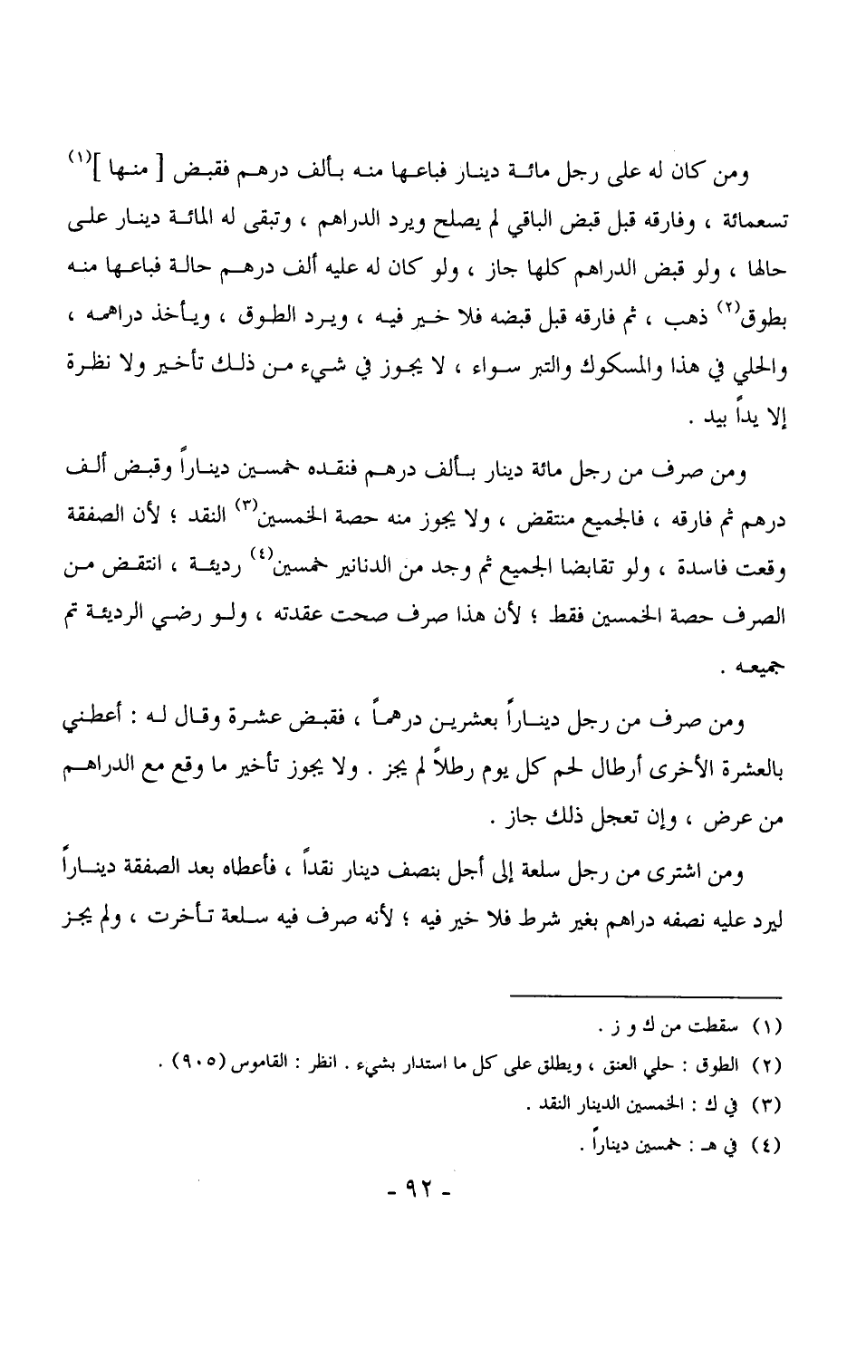ومن كان له على رجل مائة دينار فباعها منه بألف درهم فقبض [منها] تسعمائة، وفارقه قبل قبض الباقي لم يصلح ويرد الدراهم، وتبقى له المائة دينار على حالها، ولو قبض الدراهم كلها جاز، ولو كان له عليه ألف درهم حالة فباعها منه بطوق ذهب، ثم فارقه قبل قبضه فلا خير فيه، ويرد الطوق، ويأخذ دراهمه، والحلي في هذا والمسكوك والتبر سواء، لا يجوز في شيء من ذلك تأخير ولا نظرة إلا يداً بيد.