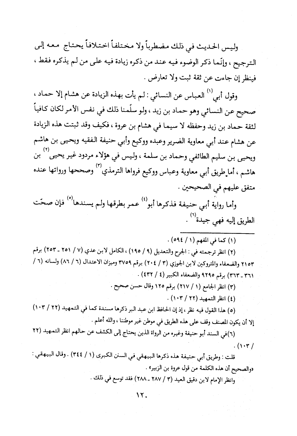وقول أبي (¬1) العباس عن النسائي: لم يأت بهذه الزيادة عن هشام إلا حماد، صحيح عن النسائي وهو حماد بن زيد، ولو سلمنا ذلك في نفس الأمر لكان كافيًا لثقة حماد بن زيد وحفظه لا سيما في هشام بن عروة، فكيف وقد ثبتت هذه الزيادة عن هشام عند أبي معاوية الضرير وعبده ووكيع وأبي حنيفة الفقيه ويحيى بن هاشم ويحيى بن سليم الطائفي وحماد بن سلمة، وليس في هؤلاء مردود غير يحيى (¬2) بن هاشم، أما طريق أبي معاوية وعباس ووكيع فرواها الترمذي (¬3) وصححها ورواتها عنده متفق عليهم في الصحيحين.