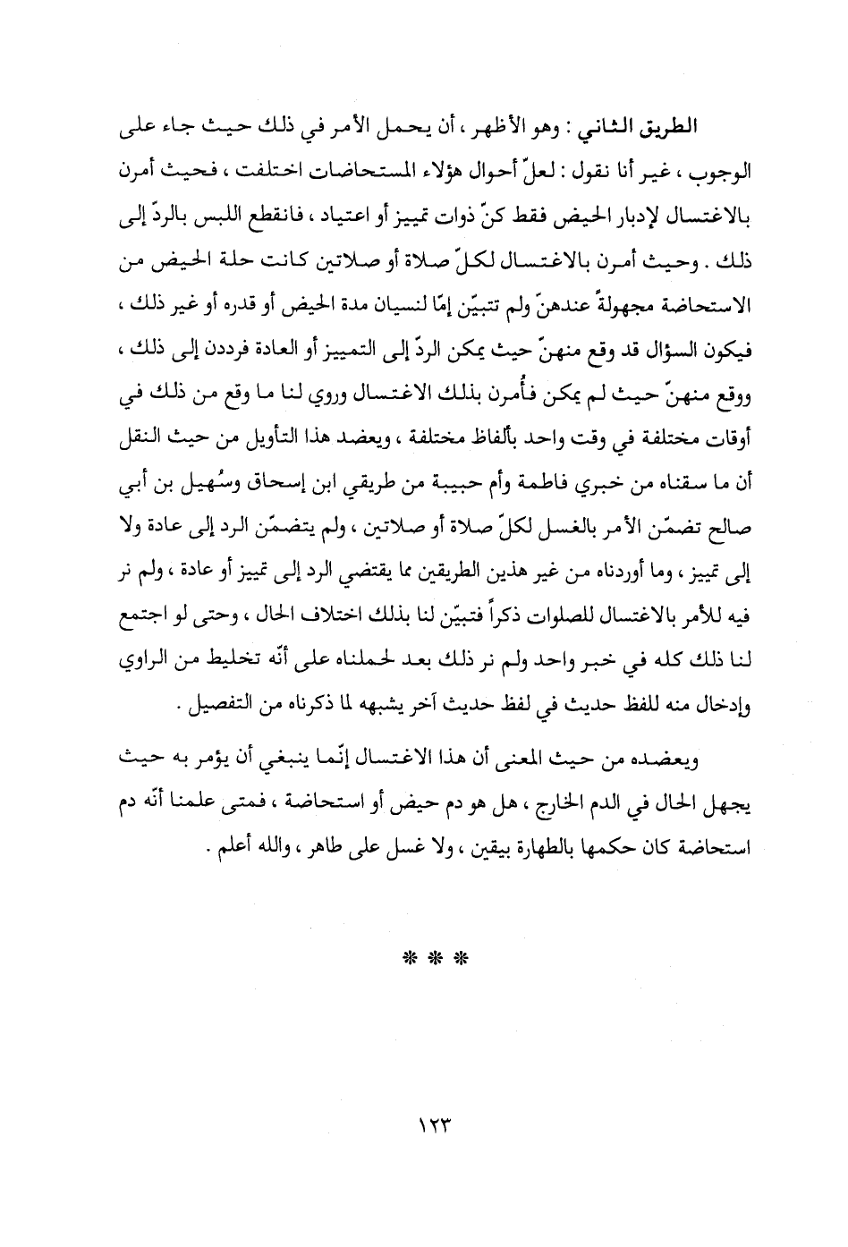 الطريق الثاني: وهو الأظهر، أن يحمل الأمر في ذلك حيث جاء على الوجوب، غير أنا نقول: لعلّ أحوال هؤلاء المستحاضات اختلفت، فحيث أمرن بالاغتسال لإدبار الحيض فقط كن ذوات تمييز أو اعتياد، فانقطع اللبس بالردّ إلى ذلك. وحيث أمرن بالاغتسال لكلّ صلاة أو صلاتين كانت حلة الحيض من الاستحاضة مجهولة عندهنّ ولم تتبيّن إما لنسيان مدة الحيض أو قدره أو غير ذلك، فيكون السؤال قد وقع منهن حيث يمكن الردَ إلى التمييز أو العادة فرددن إلى ذلك، ووقع منهنّ حيث لم يمكن فأُمرن بذلك الاغتسال وروي لنا ما وقع من ذلك في أوقات مختلفة في وقت واحد بألفاظ مختلفة، ويعضد هذا التأويل من حيث النقل أن ما سقناه من خبري فاطمة وأم حبيبة من طريقي ابن إسحاق وسُهيل بن أبي صالح تضمّن الأمر بالغسل لكل صلاة أو صلاتين، ولم يتضمَّن الرد إلى عادة ولا إلى تمييزٍ، وما أوردناه من غير هذين الطريقين مما يقتضي الرد إلى تمييزٍ أو عادة، ولم نر فيه للأمر بالاغتسال للصلوات ذكرًا فتبيّن لنا بذلك اختلاف الحال، وحتى لو اجتمع لنا ذلك كله في خبر واحد ولم نر ذلك بعد لحملناه على أنه تخليط من الراوي وإدخال منه للفظ حديث في لفظ حديث آخر يشبهه لما ذكرناه من التفصيل.