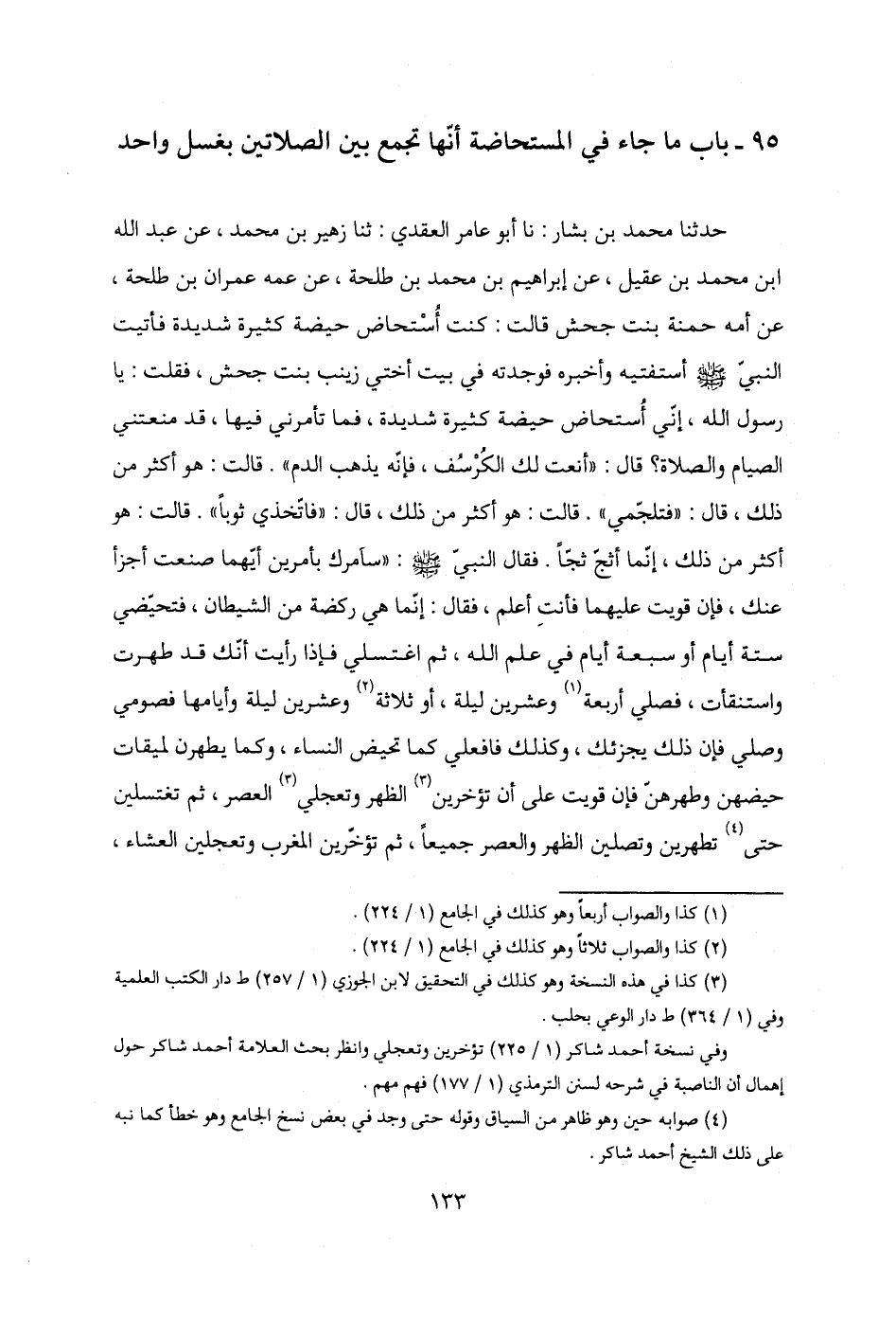حدثنا محمَّد بن بشار: نا أبو عامر العقدي: ثنا زهير بن محمَّد، عن عبد الله بن محمَّد بن عقيل، عن إبراهيم بن محمَّد بن طلحة، عن عمه عمران بن طلحة، عن أمه حمنة بنت جحش قالت: كنت أُسْتحاض حيضة كثيرة شديدة فأتيت النبي - صلى الله عليه وسلم - أستفتيه وأخبره فوجدته في بيت أختي زينب بنت جحش، فقلت: يا رسول الله، إني أُستحاض حيضة كثيرة شديدة، فما تأمرني فيها، قد منعتني الصيام والصلاة؟ قال: "أنعت لك الكُرْسُف، فإنّه يذهب الدم". قالت: هو أكثر من ذلك، قال: "فتلجّمي". قالت: هو أكثر من ذلك، قال: "فاتخذي ثوبًا". قالت: هو أكثر من ذلك، إنّما أثجّ ثجًّا. فقال النبي - صلى الله عليه وسلم -: "سآمرك بأمرين أيهما صنعت أجزأ عنك، فإن قويت عليهما فأنتِ أعلم، فقال: إنما هي ركضة من الشيطان، فتحيضي ستة أيام أو سبعة أيام في علم الله، ثم اغتسلي فإذا رأيت أنك قد طهرت واستنقأت، فصلي أربعة (¬1) وعشرين ليلة، أو ثلاثة (¬2) وعشرين ليلة وأيامها فصومي وصلي فإن ذلك يجزئك، وكذلك فافعلي كما تحيض النساء، وكما يطهرن لميقات حيضهن وطهرهن فإن قويت على أن تؤخرين (3) الظهر وتعجلي (¬3) العصر، ثم تغتسلين حتى (¬4) تطهرين وتصلين الظهر والعصر جميعًا، ثم تؤخرين الغرب وتعجلين العشاء،