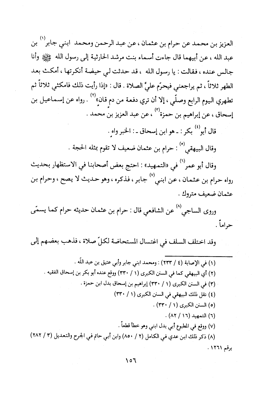 العزيز بن محمد عن حرام بن عثمان، عن عبد الرحمن ومحمد ابني جابر (¬1) بن عبد الله، عن أبيهما قال جاءت أسماء بنت مرشد الحارثية إلى رسول الله - صلى الله عليه وسلم - وأنا جالس عنده، فقالت: يا رسول الله، قد حدثت لي حيضة أنكرتها، أمكث بعد الطهر ثلاثًا، ثم يراجعني فيحرّم عليَّ الصَّلاة. قال: "إذا رأيت ذلك فامكثي ثلاثًا ثم تطهري اليوم الرابع وصلّي، إلَّا أن تري دفعة من دم قانٍ" (¬2). رواه عن إسماعيل بن إسحاق، عن إبراهيم بن حمزة (¬3)، عن عبد العزيز بن محمد.