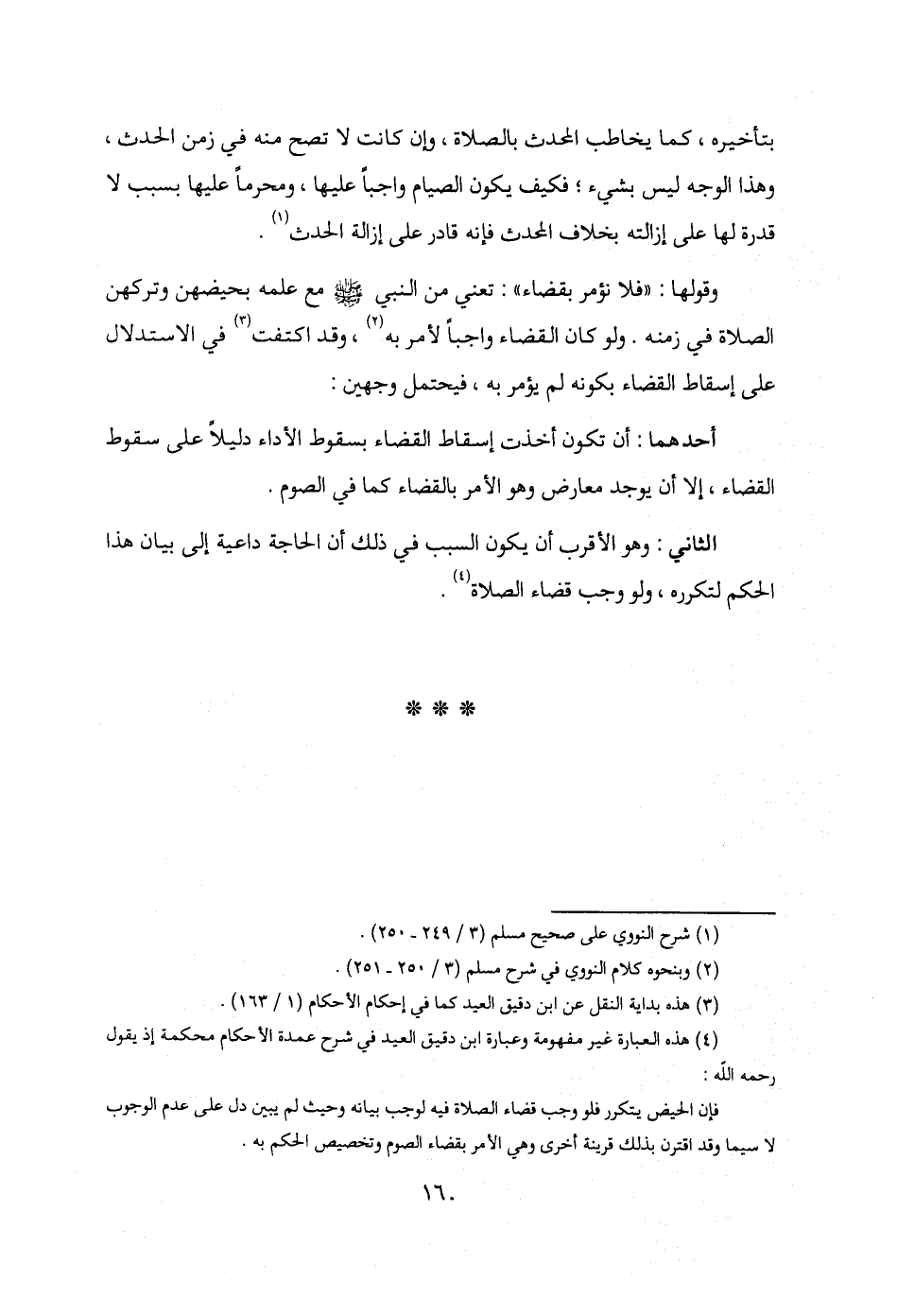 فإن الحيض يتكرر فلو وجب قضاء الصَّلاة فيه لوجب بيانه وحيث لم يبين دل على عدم الوجوب لا سيما وقد اقترن بذلك قرينة أخرى وهي الأمر بقضاء الصوم وتخصيص الحكم به.