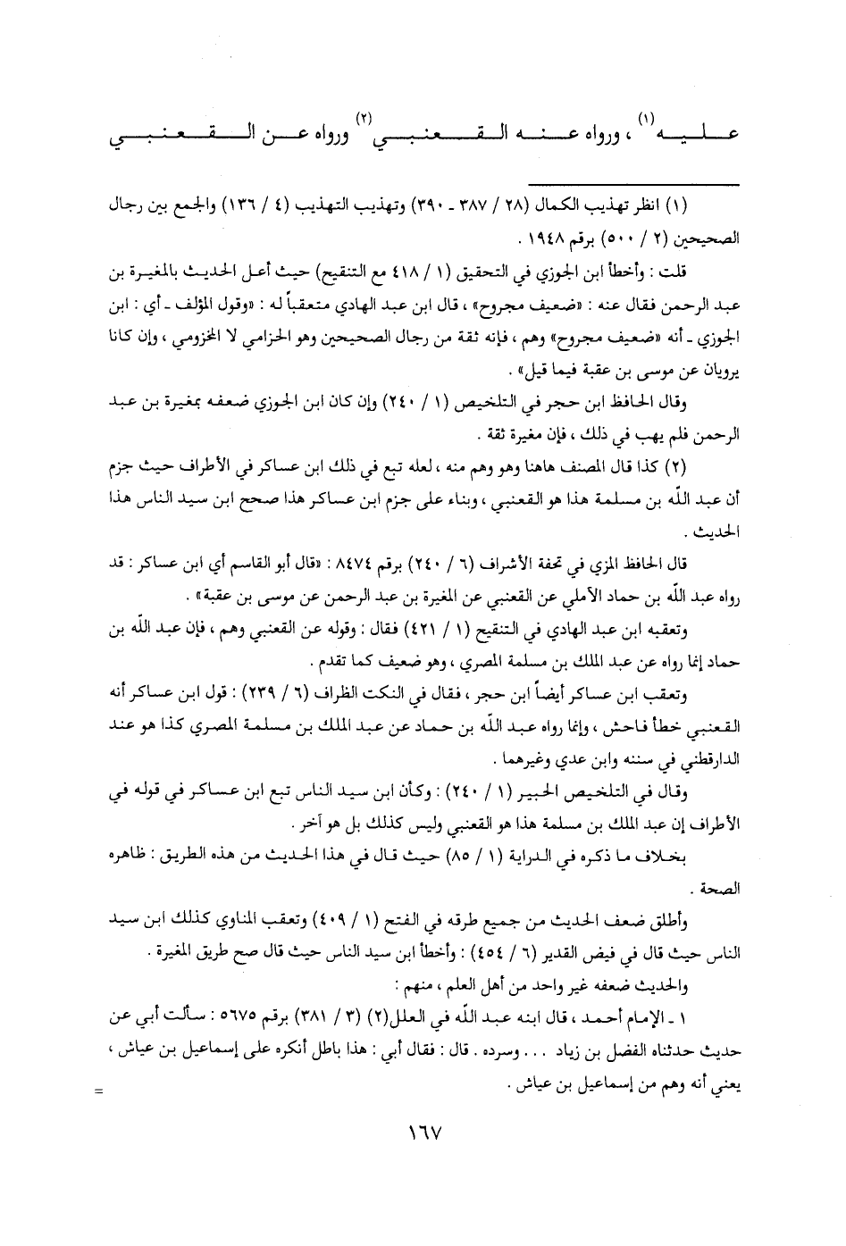قلت: وأخطأ ابن الجوزي في التحقيق (1/ 418 مع التنقيح) حيث أعل الحديث بالمغيرة بن عبد الرحمن فقال عنه: "ضعيف مجروح" قال ابن عبد الهادي متعقبًا له: "وقول المؤلف -أي: ابن الجوزي- أنَّه "ضعيف مجروح" وهم، فإنَّه ثقة من رجال الصحيحين وهو الحزامي لا المخزومي، وإن كانا يرويان عن موسى بن عقبة فيما قيل".
