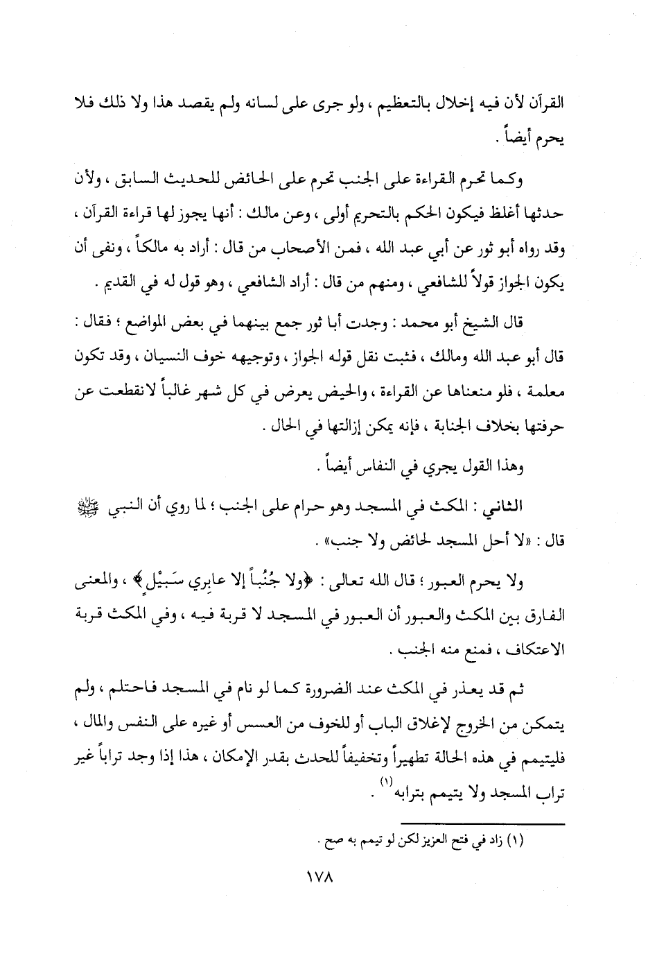 الثَّاني: المكث في المسجد وهو حرام على الجنب؛ لما روي أن النَّبيَّ - صلى الله عليه وسلم - قال: "لا أحل المسجد لحائض ولا جنب".