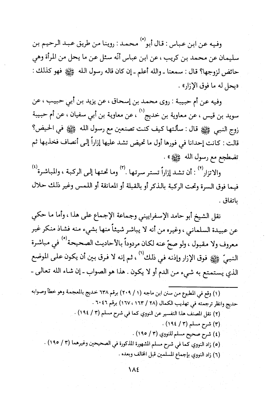 روينا من طريق عبد الرحيم بن سليمان عن محمد بن كريب، عن ابن عباس أنَّه سئل عن ما يحل من المرأة وهي حائض لزوجها؟ قال: سمعنا -والله أعلم- إن كان قاله رسول الله - صلى الله عليه وسلم - فهو كذلك: "يحل له ما فوق الإزار".