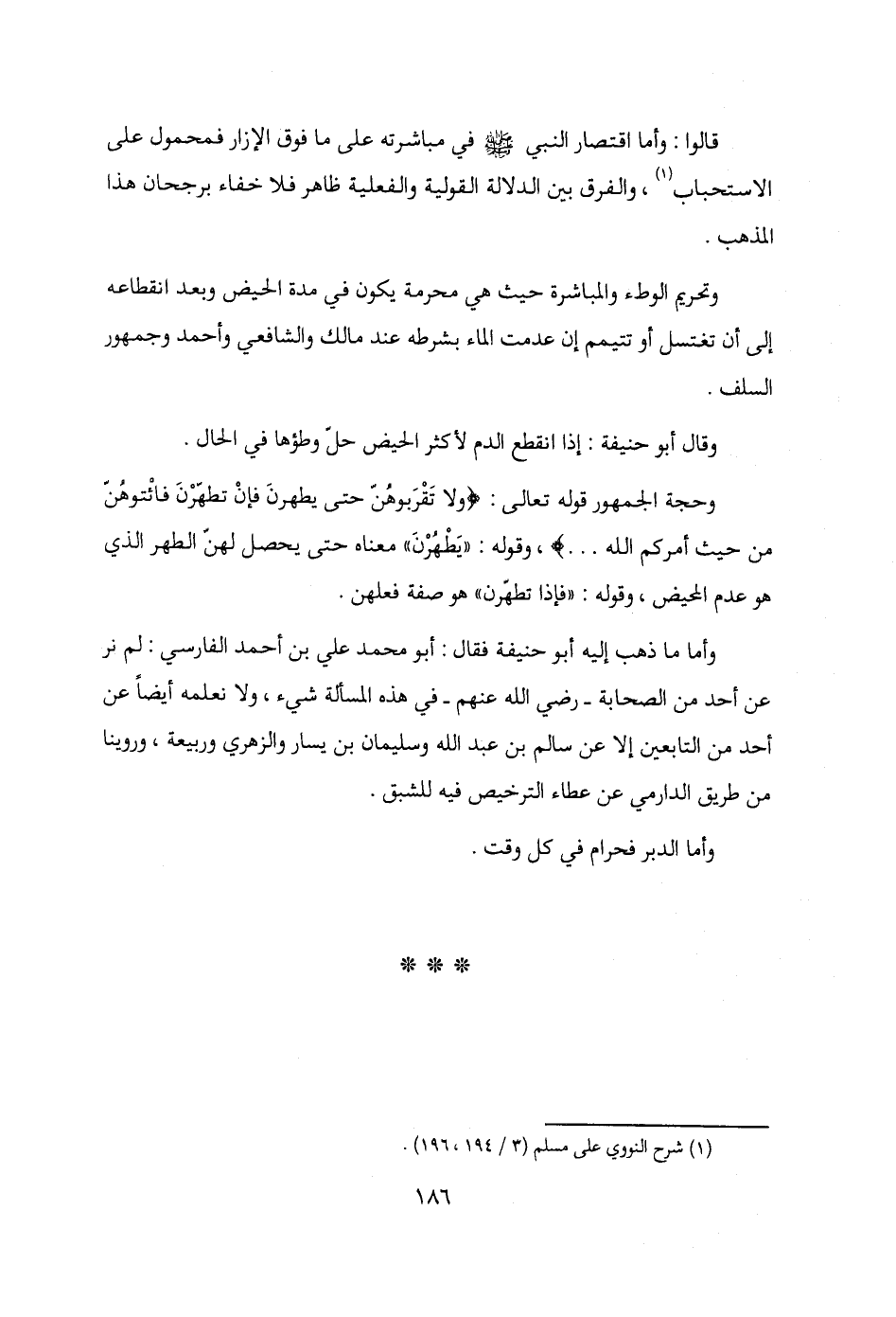 قالوا: وأمَّا اقتصار النَّبيِّ - صَلَّى الله عليه وسلم - في مباشرته على ما فوق الإزار فمحمول على الاستحباب (¬1)، والفرق بين الدلالة القولية والفعلية ظاهر فلا خفاء برجحان هذا المذهب.