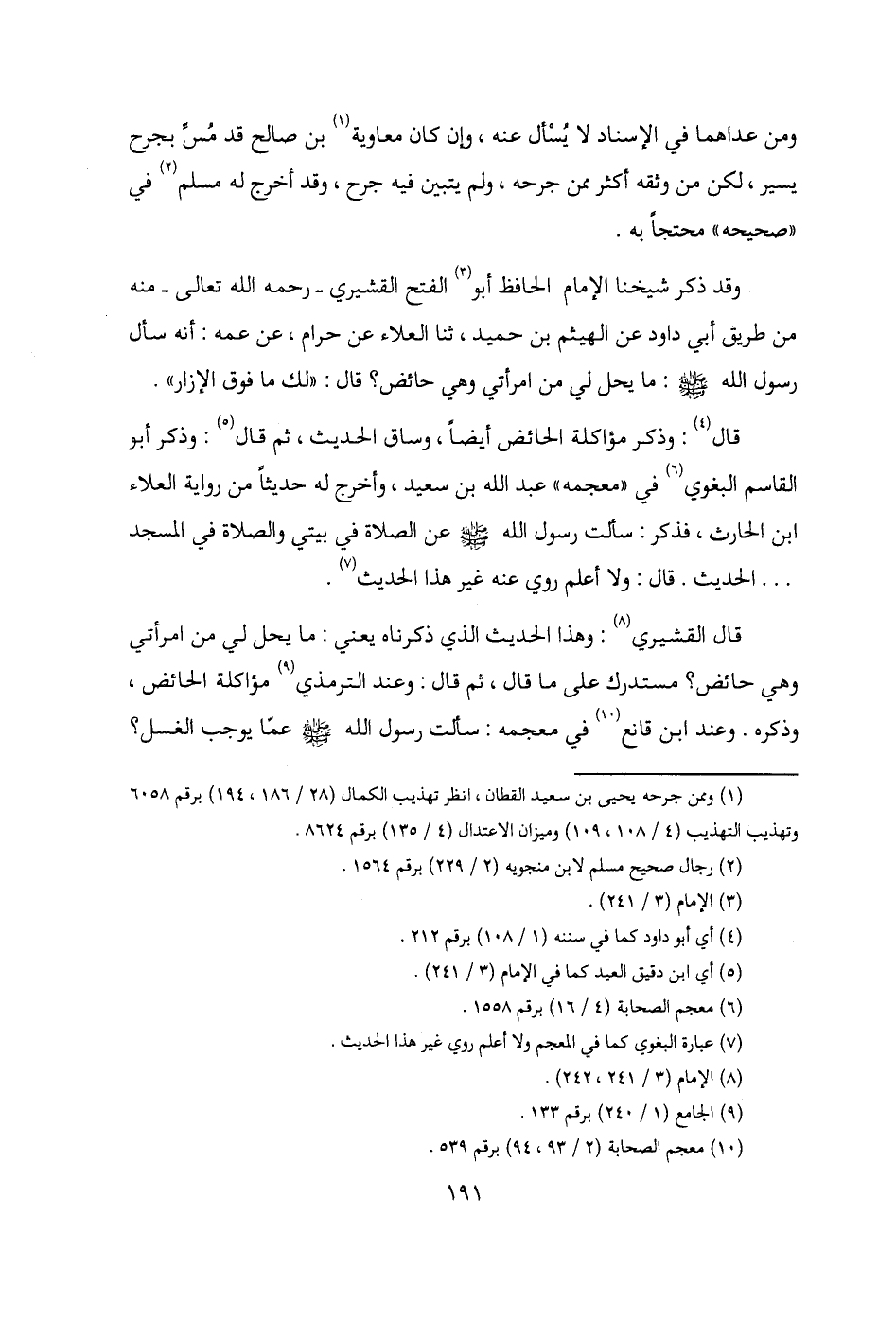 قال القشيري (¬8): وهذا الحديث الذي ذكرناه يعني: ما يحل لي من امرأتي وهي حائض؟ مستدرك على ما قال، ثم قال: وعند التِّرمذيِّ (¬9) مؤاكلة الحائض، وذكره. وعند ابن قانع (¬10) في معجمه: سألت رسول الله - صلى الله عليه وسلم - عمّا يوجب الغسل؟