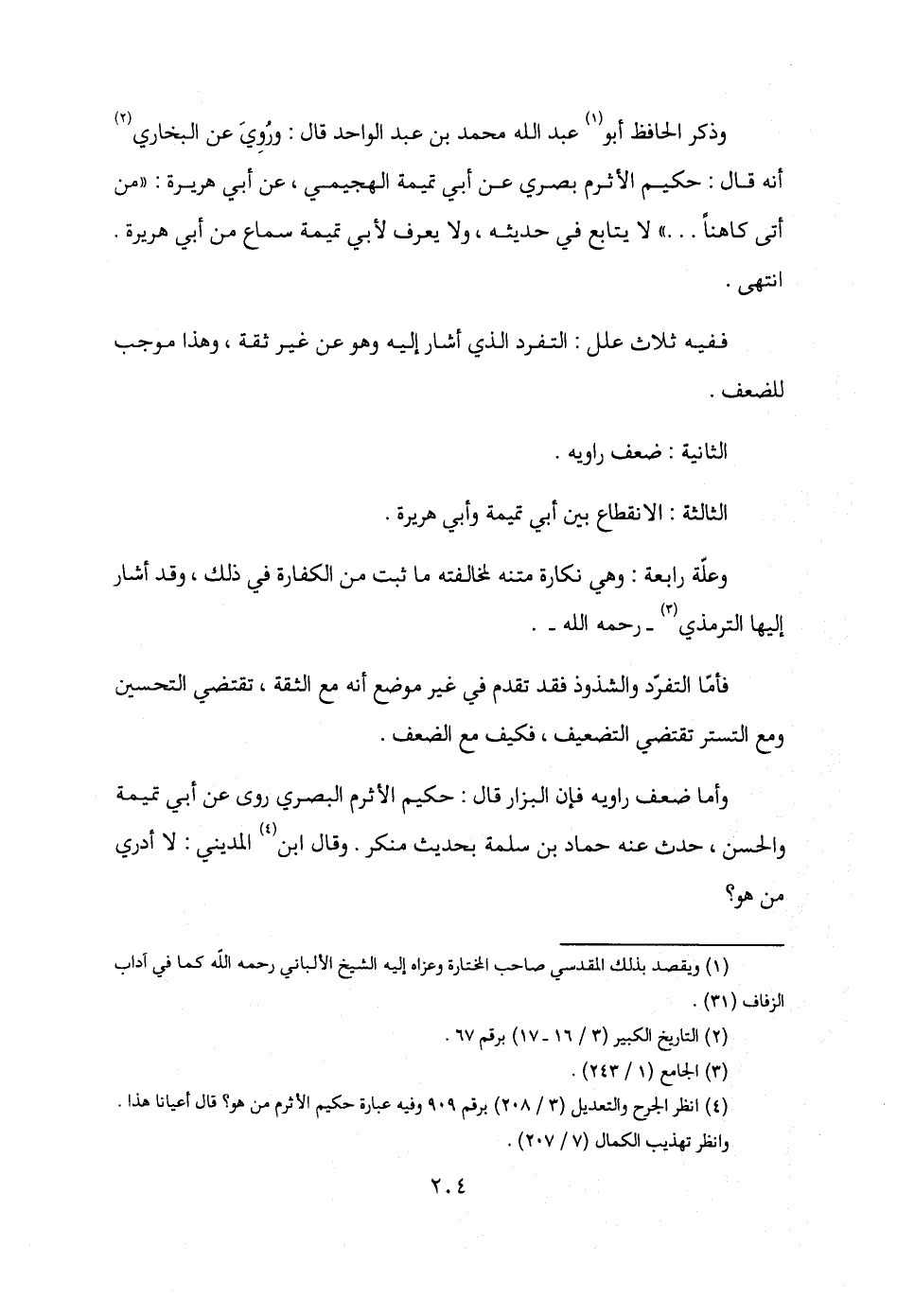 وذكر الحافظ أبو (¬1) عبد الله محمد بن عبد الواحد قال: ورُويَ عن البخاري (¬2) أنه قال: حكيم الأثرم بصري عن أبي تميمة الهجيمي، عن أبي هريرة: "من أتى كاهنًا. . ." لا يتابع في حديثه، ولا يعرف لأبي تميمة سماع من أبي هريرة. انتهى.
