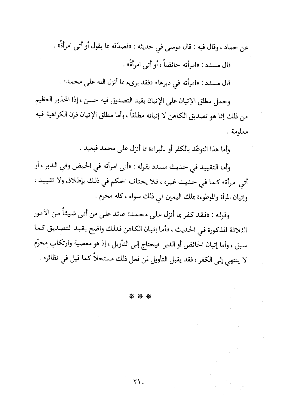 وأما التقييد في حديث مسدد بقوله: "أتى امرأته في الحيض وفي الدبر، أو أتي امرأة" كما في حديث غيره، فلا يختلف الحكم في ذلك بإطلاق ولا تقييد، وإتيان المرأة والوطوءة بملك اليمين في ذلك سواء، كله محرم.
