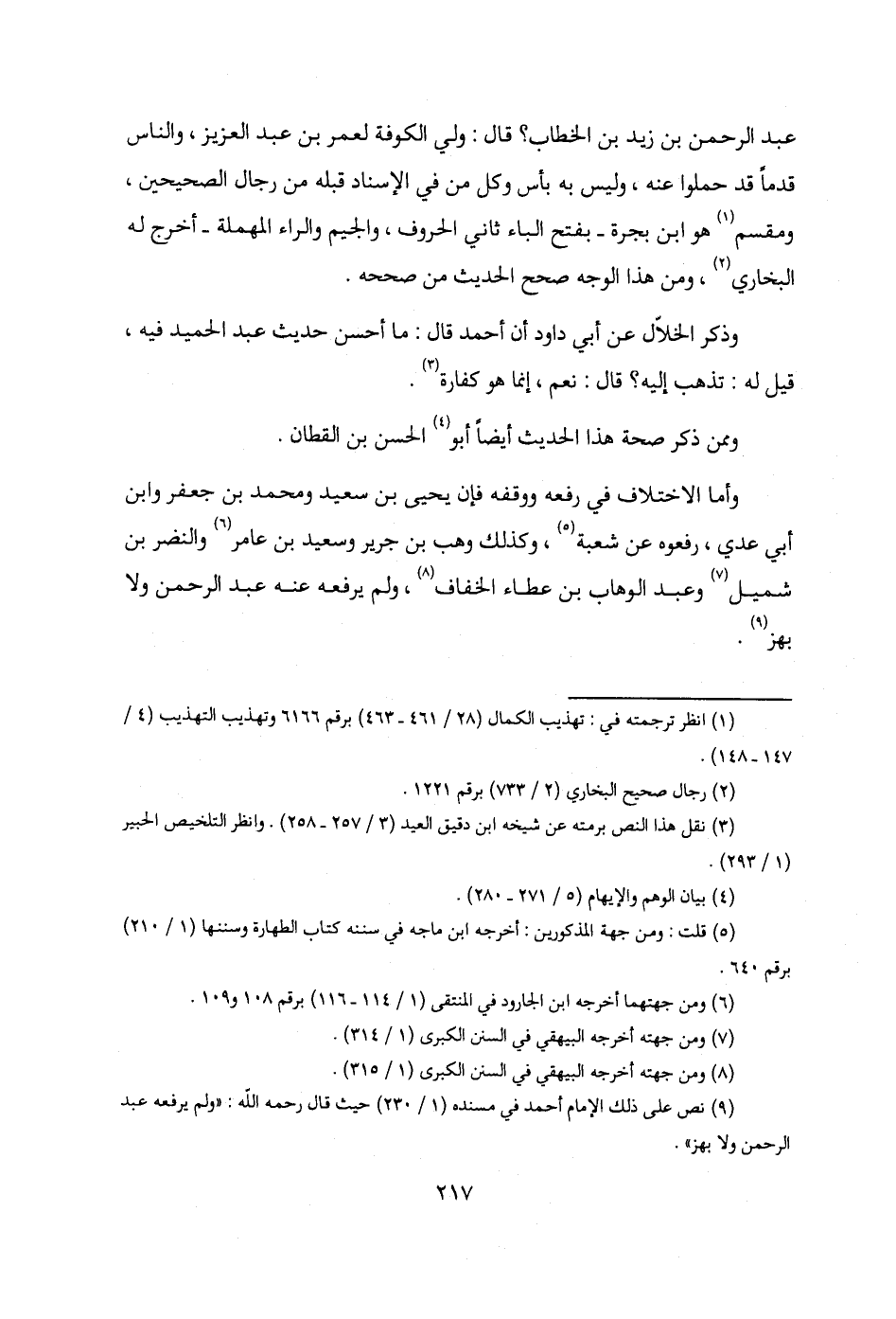 (¬9) نص على ذلك الإمام أحمد في مسنده (1/ 230) حيث قال رحمه الله: "ولم يرفعه عبد الرحمن ولا بهز".