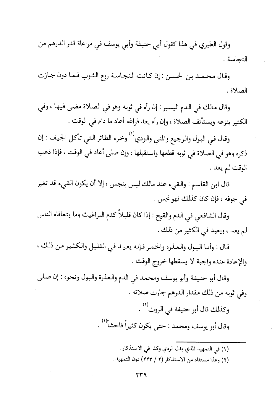 وقول الطبري في هذا كقول أبي حنيفة وأبي يوسف في مراعاة قدر الدرهم من النجاسة.