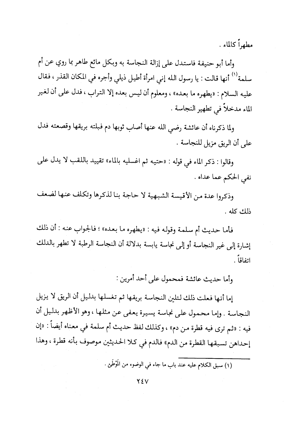 فأما حديث أم سلمة وقوله فيه: "يطهره ما بعده"؛ فالجواب عنه: أن ذلك إشارة إلى غير النجاسة أو إلى نجاسة يابسة بدلالة أن النجاسة الرطبة لا تطهر بالدلك اتفاقًا.
