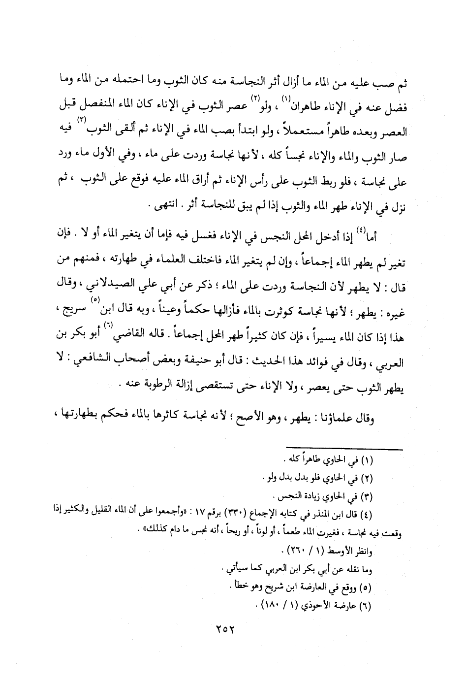 (¬4) قال ابن المنذر في كتابه الإجماع (330) برقم 17: "وأجمعوا على أن الماء القليل والكثير إذا وقعت فيه نجاسة، فغيرت الماء طعمًا، أو لونًا، أو ريحًا، أنَّه نجس ما دام كذلك".