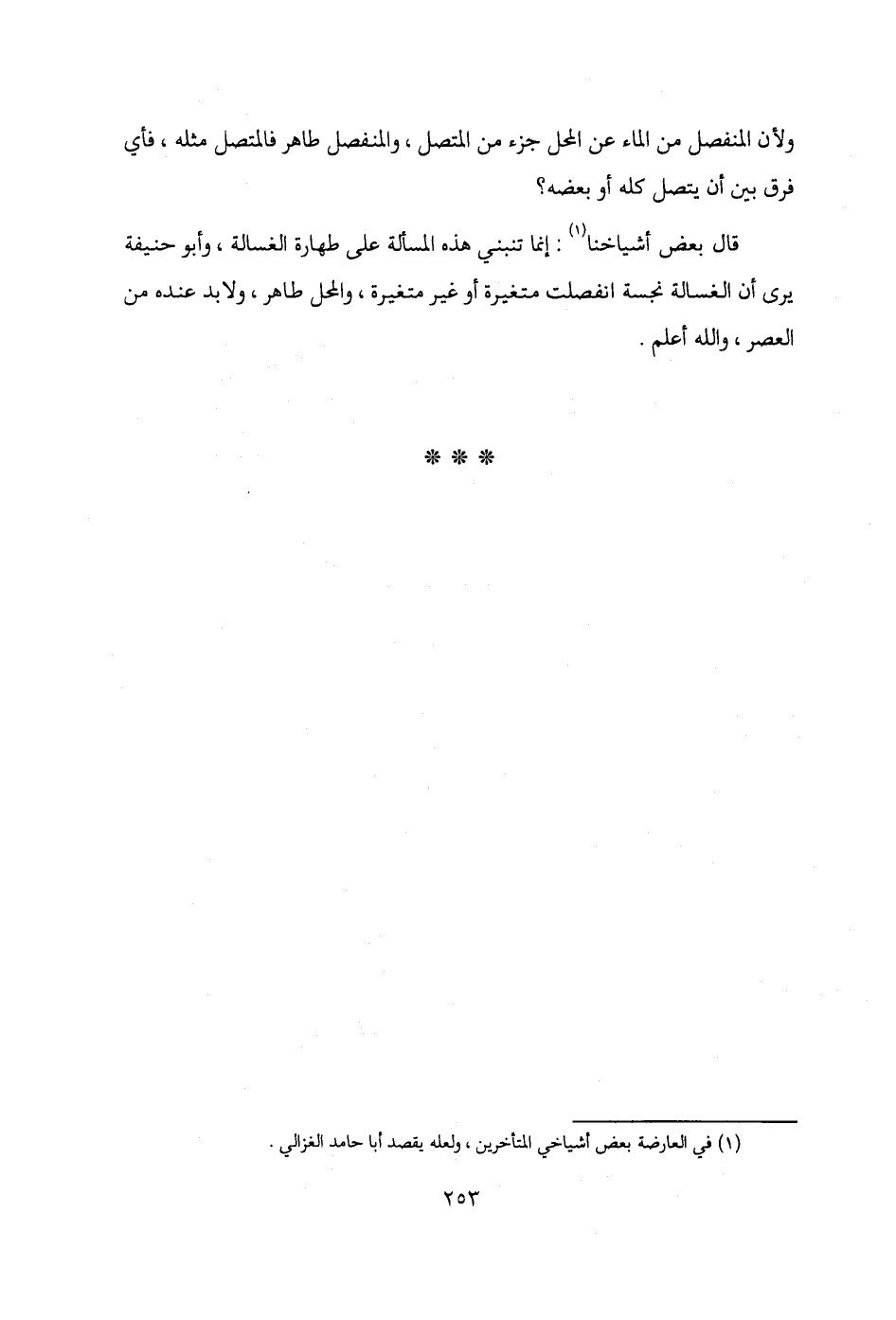 ولأن المنفصل من الماء عن المحل جزء من المتصل، والمنفصل طاهر فالمتصل مثله، فأي فرق بين أن يتصل كله أو بعضه؟