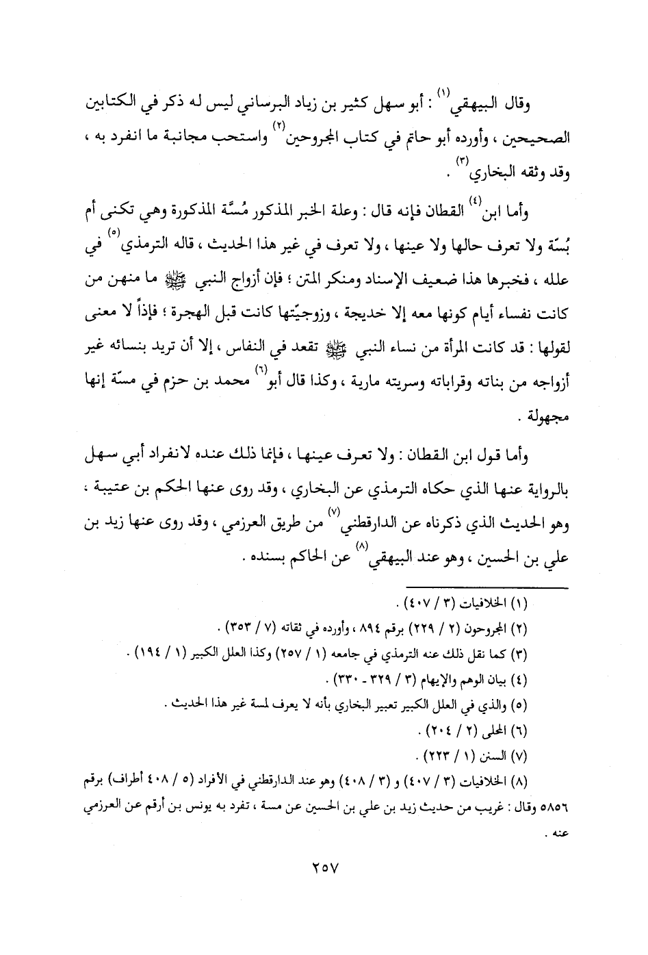 وأما قول ابن القطان: ولا تعرف عينها، فإنما ذلك عنده لانفراد أبي سهل بالرواية عنها الَّذي حكاه الترمذي عن البخاري، وقد روى عنها الحكم بن عتيبة: وهو الحديث الَّذي ذكرناه عن الدارقطني (¬7) من طريق العرزمي، وقد روى عنها زيد بن علي بن الحسين، وهو عند البيهقي (¬8) عن الحاكم بسنده.