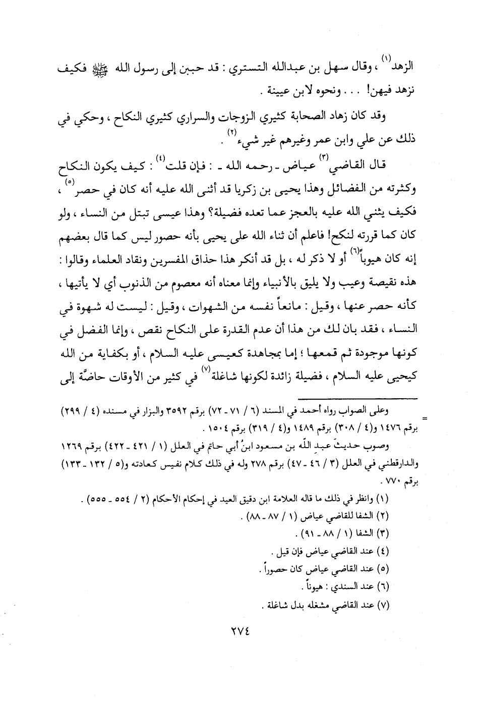 قال القاضي (¬3) عياض -رحمه الله-: فإن قلت (¬4): كيف يكون النِّكَاح وكثرته من الفضائل وهذا يحيى بن زكريا قد أثنى الله عليه أنَّه كان في حصر (¬5)، فكيف يثني الله عليه بالعجز عما تعده فضيلة؛ وهذا عيسى تبتل من النساء، ولو كان كما قررته لنكح! فاعلم أن ثناء الله على يحيى بأنه حصور ليس كما قال بعضهم إنه كان هيوبًا (¬6) أو لا ذكر له، بل قد أنكر هذا حذاق المفسرين ونقاد العلماء وقالوا: هذه نقيصة وعيب ولا يليق بالأنبياء وإنما معناه أنَّه معصوم من الذنوب أي لا يأتيها، كأنه حصر عنها، وقيل: مانعًا نفسه من الشهوات، وقيل: ليست له شهوة في النساء، فقد بأن لك من هذا أن عدم القدرة على النِّكَاح نقص، وإنما الفضل في كونها موجودة ثم قمعها؛ إما بمجاهدة كعيسى - عليه السلام -، أو بكفاية من الله كيحيى - عليه السلام -، فضيلة زائدة لكونها شاغلة (¬7) في كثير من الأوقات حاضةً إلى