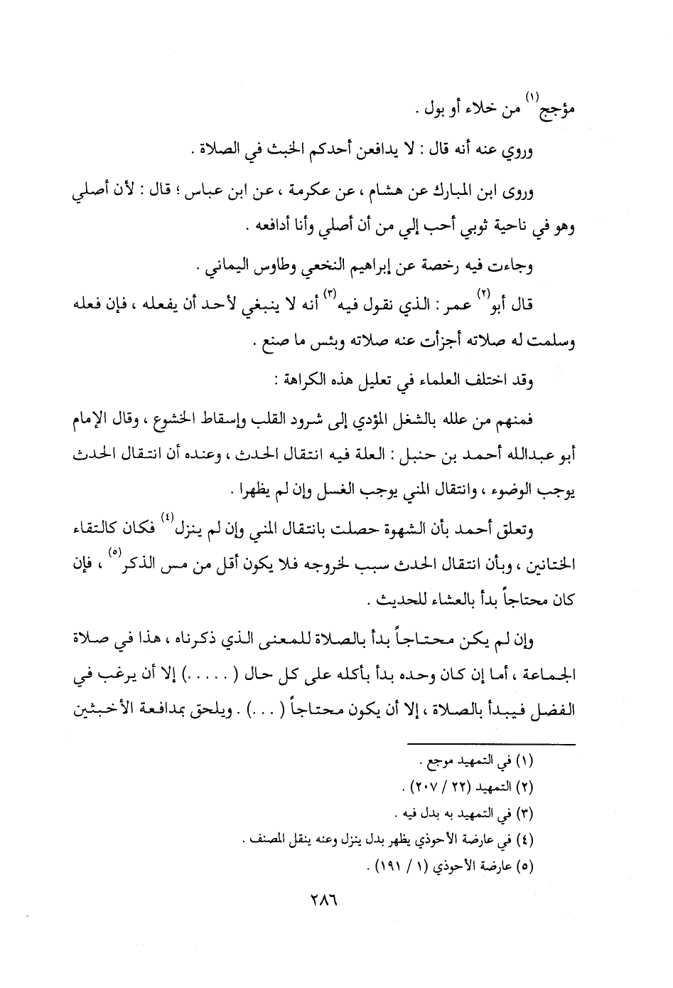 فمنهم من علله بالشغل المؤدي إلى شرود القلب وإسقاط الخشوع، وقال الإمام أبو عبد الله أحمد بن حنبل: العلة فيه انتقال الحديث، وعنده أن انتقال الحديث يوجب الوضوء، وانتقال المني يوجب الغسل وإن لم يظهرا.