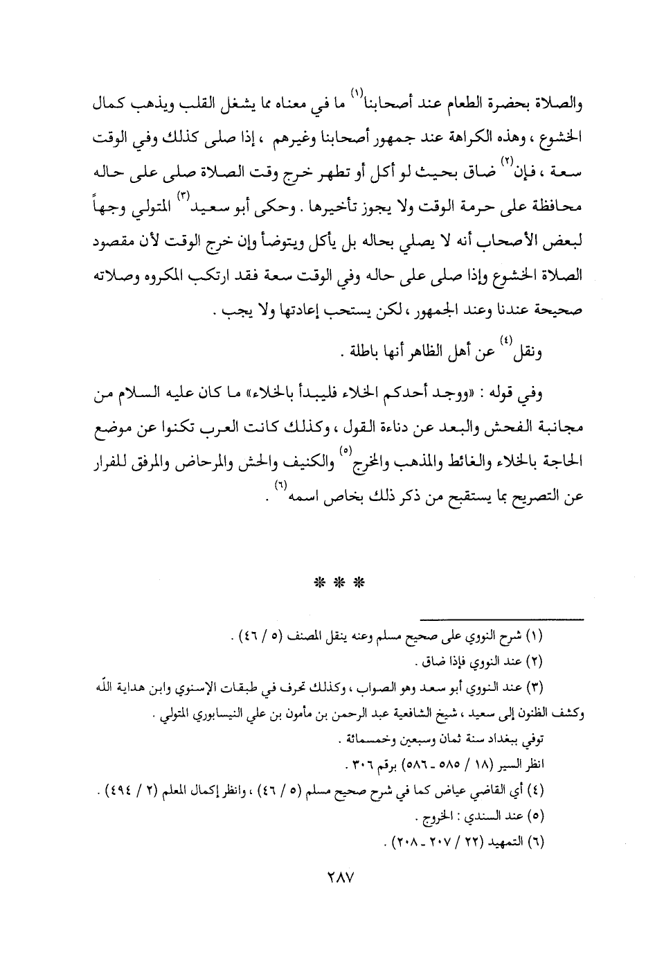 والصلاة بحضرة الطعام عند أصحابنا (¬1) ما في معناه مما يشغل القلب ويذهب كمال الخشوع، وهذه الكراهة عند جمهور أصحابنا وغيرهم، إذا صلى كذلك وفي الوقت سعة، فإن (¬2) ضاق بحيث لو أكل أو تطهر خرج وقت الصلاة صلى على حاله محافظة على حرمة الوقت ولا يجوز تأخيرها. وحكى أبو سعيد (¬3) المتولي وجهًا لبعض الأصحاب أنَّه لا يصلي بحاله بل يأكل ويتوضأ وإن خرج الوقت لأن مقصود الصلاة الخشوع وإذا صلى على حاله وفي الوقت سعة فقد ارتكب المكروه وصلاته صحيحة عندنا وعند الجمهور، لكن يستحب إعادتها ولا يجب.