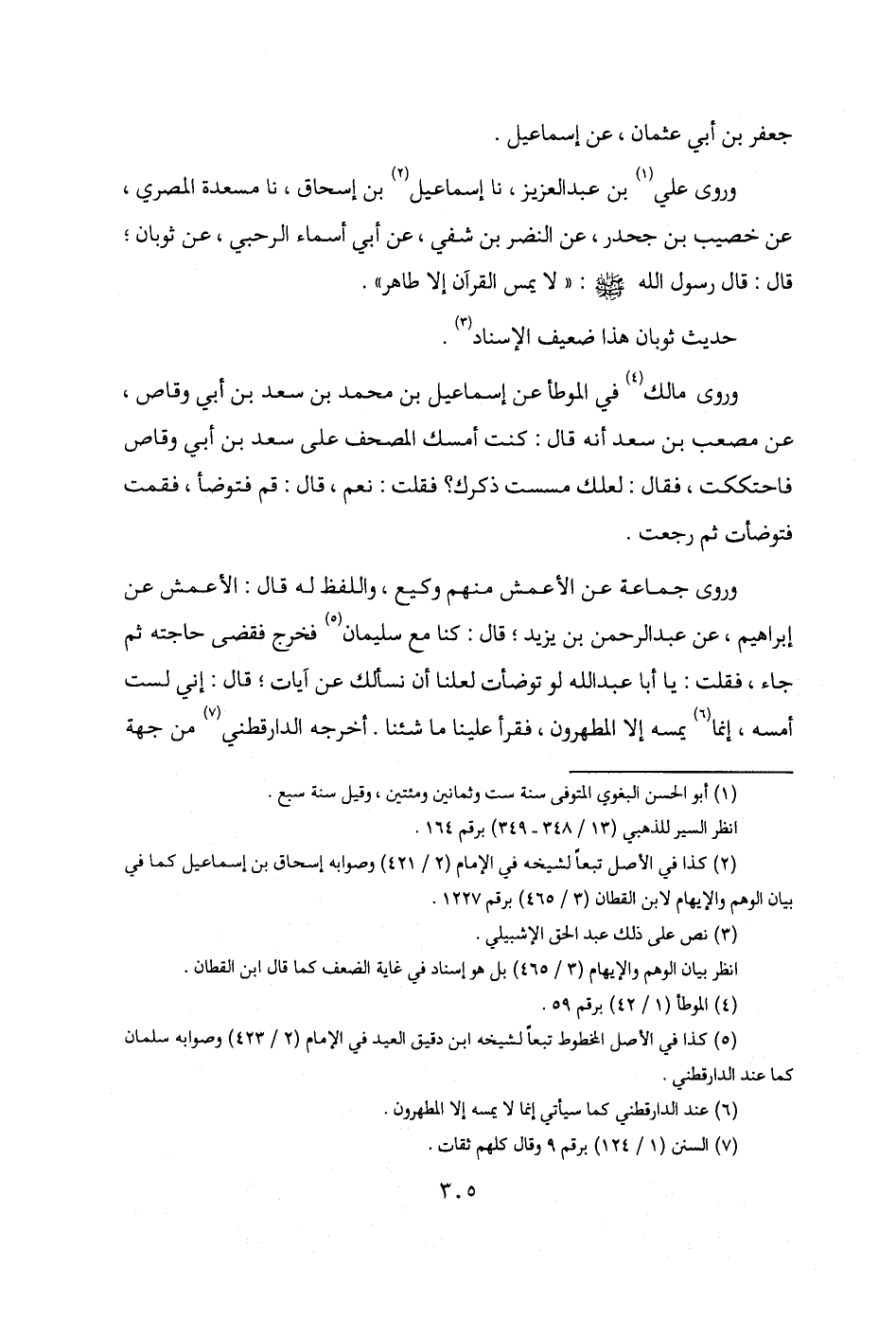 وروى جماعة عن الأعمش منهم وكيع، واللفظ له قال: الأعمش عن إبراهيم، عن عبد الرحمن بن يزيد؛ قال: كنا مع سليمان (¬5) فخرج فقضى حاجته ثم جاء، فقلت: يا أبا عبد الله لو توضأت لعلنا أن نسألك عن آيات؛ قال: إني لست أمسه، إنما (¬6) يمسه إلا المطهرون، فقرأ علينا ما شئنا. أخرجه الدارقطني (¬7) من جهة