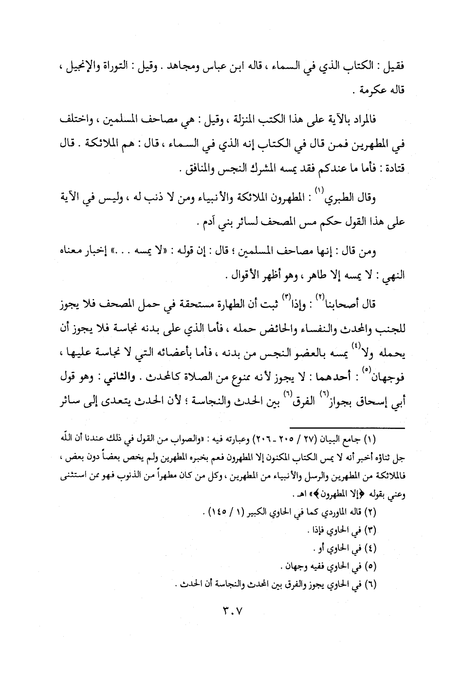 (¬1) جامع البيان (27/ 205 - 206) وعبارته فيه: "والصواب من القول في ذلك عندنا أن الله جل ثناؤه أخبر أنه لا يمس الكتاب المكنون إلا المطهرون فعم بخبره المطهرين ولم يخص بعضًا دون بعض، فالملائكة من المطهرين والرسل والأنبياء من المطهرين، وكل من كان مطهرًا من الذنوب فهو ممن استثنى وعني بقوله {إلا المطهرون} أهـ.