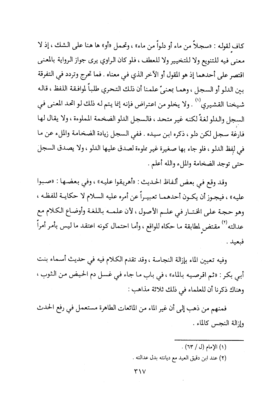 كافٍ لقوله: "سجلًا من ماء أو دلوًا من ماء"، وتحمل "أو" ها هنا على الشك، إذ لا معنى فيه للتنويم ولا للتخيير ولا للعطف، فلو كان الراوي يرى جواز الرواية بالمعنى اقتصر على أحدهما إذ هو المقول أو الأخر الذي في معناه. فما تحرج وتردد في التفرقة بين الدلو أو السجل، وهما بمعنىً علمنا أن ذلك التحري طلبًا لموافقة اللفظ، قاله شيخنا القشيري (¬1). ولا يخلو من اعتراض فإنه إنما يتم له ذلك لو اتحد المعنى في السجل والدلو لغةً لكنه غير متحد، فالسجل الدلو الضخمة المملوءة، ولا يقال لها فارغة سجل لكن دلو، ذكره ابن سيده. ففي السجل زيادة الضخامة والملء عن ما في لفظ الدلو، فلو جاء بها صغيرة غير مملوءة لصدق عليها الدلو، ولا يصدق السجل حتى توجد الضخامة والملء والله أعلم.