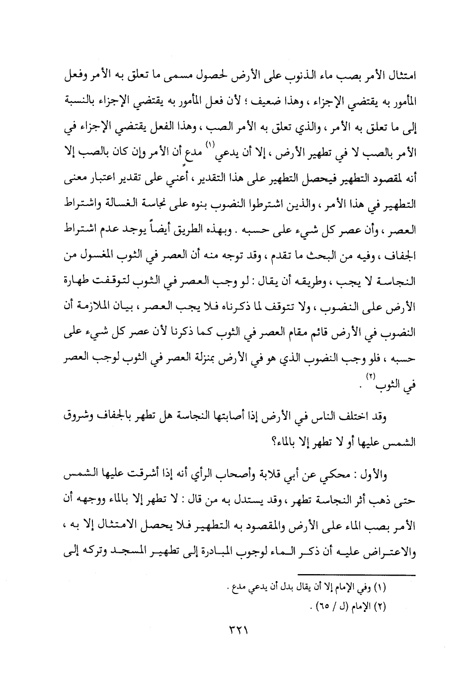امتثال الأمر بصب ماء الذنوب على الأرض لحصول مسمى ما تعلق به الأمر وفعل المأمور به يقتضي الإجزاء، وهذا ضعيف؛ لأن فعل المأمور به يقتضي الإجزاء بالنسبة إلى ما تعلق به الأمر، والذي تعلق به الأمر الصب، وهذا الفعل يقتضي الإجزاء في الأمر بالصب لا في تطهير الأرض، إلا أن يدعي (¬1) مدعٍ أن الأمر وإن كان بالصب إلا أنه لمقصود التطهير فيحصل التطهير على هذا التقدير، أعني على تقدير اعتبار معنى التطهير في هذا الأمر، والذين اشترطوا النضوب بنوه على نجاسة الغسالة واشتراط العصر، وأن عصر كل شيء على حسبه. وبهذه الطريق أيضًا يوجد عدم اشتراط الجفاف، وفيه من البحث ما تقدم، وقد توجه منه أن العصر في الثوب المغسول من النجاسة لا يجب، وطريقه أن يقال: لو وجب العصر في الثوب لتوقفت طهارة الأرض على النضوب، ولا تتوقف لما ذكرناه فلا يجب العصر، بيان الملازمة أن النضوب في الأرض قائم مقام العصر في الثوب كما ذكرنا لأن عصر كل شيء على حسبه، فلو وجب النضوب الذي هو في الأرض بمنزلة العصر في الثوب لوجب العصر في الثوب (¬2).