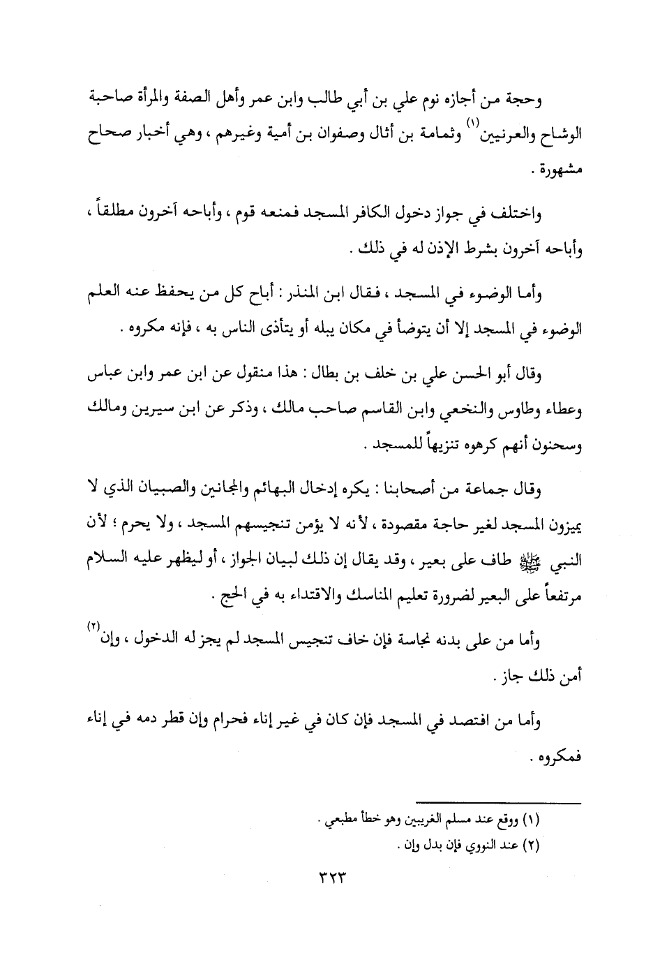 وقال أبو الحسن علي بن خلف بن بطال: هذا منقول عن ابن عمر وابن عباس وعطاء وطاوس والنخعي وابن القاسم صاحب مالك، وذكر عن ابن سيرين ومالك وسحنون أنهم كرهوه تنزيهًا للمسجد.