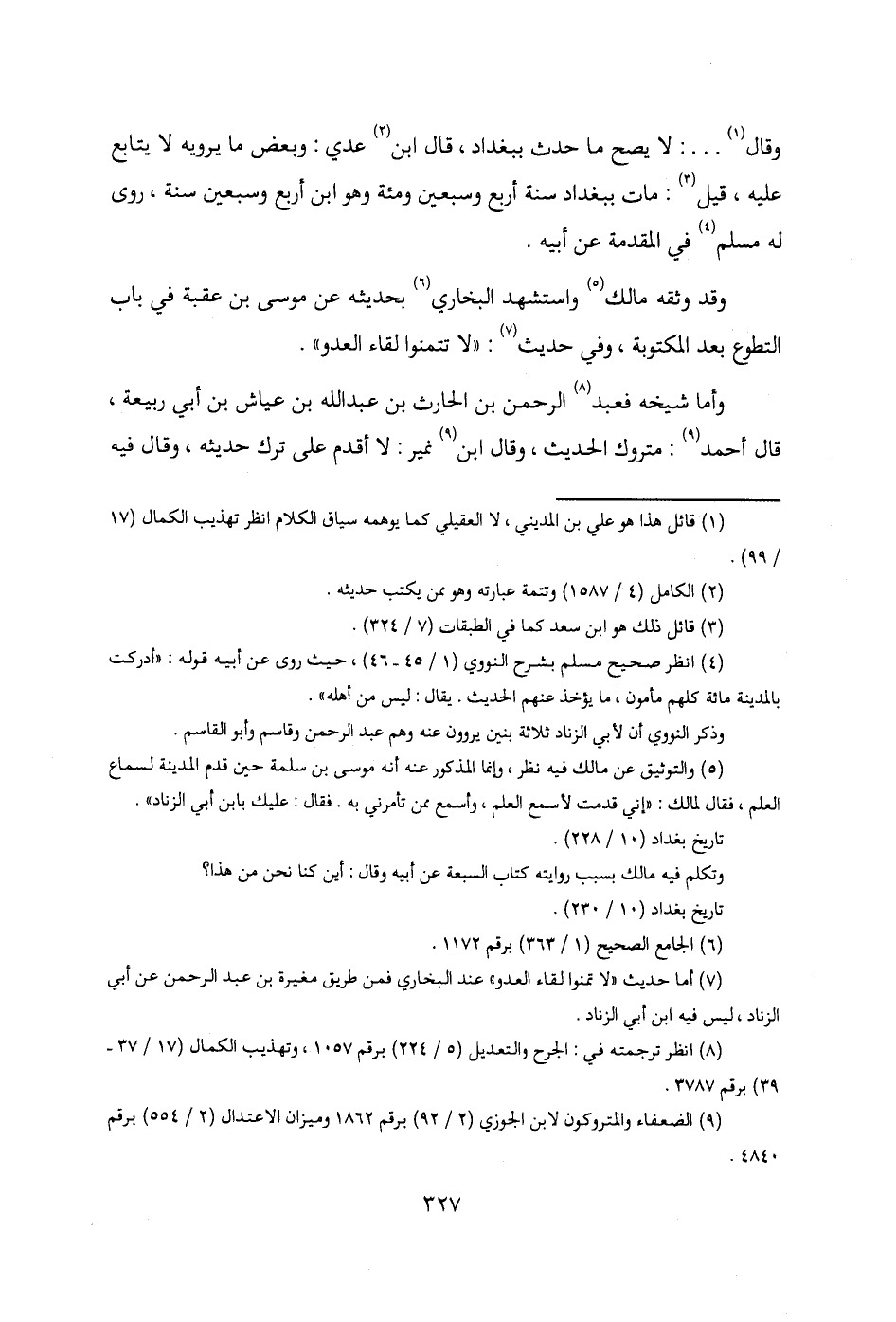 (¬7) أما حديث "لا تمنوا لقاء العدو" عند البخاري فمن طريق مغيرة بن عبد الرحمن عن أبي الزناد، ليس فيه ابن أبي الزناد.