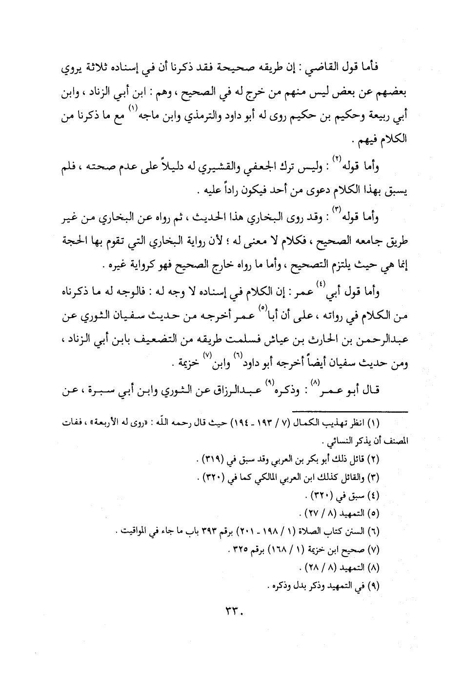 وأما قول أبي (¬4) عمر: إن الكلام في إسناده لا وجه له: فالوجه له ما ذكرناه من الكلام في رواته، على أن أبا (¬5) عمر أخرجه من حديث سفيان الثوري عن عبد الرحمن بن الحارث بن عياش فسلمت طريقه من التضعيف بابن أبي الزناد، ومن حديث سفيان أيضًا أخرجه أبو داود (¬6) وابن (¬7) خزيمة.