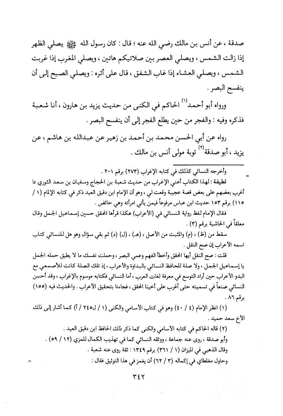 فقال الإمام لفظ رواية النسائي في (الأعراب) هكذا قرأها المحقق حسين إسماعيل الجمل وقال معلقًا في الحاشية برقم (3).