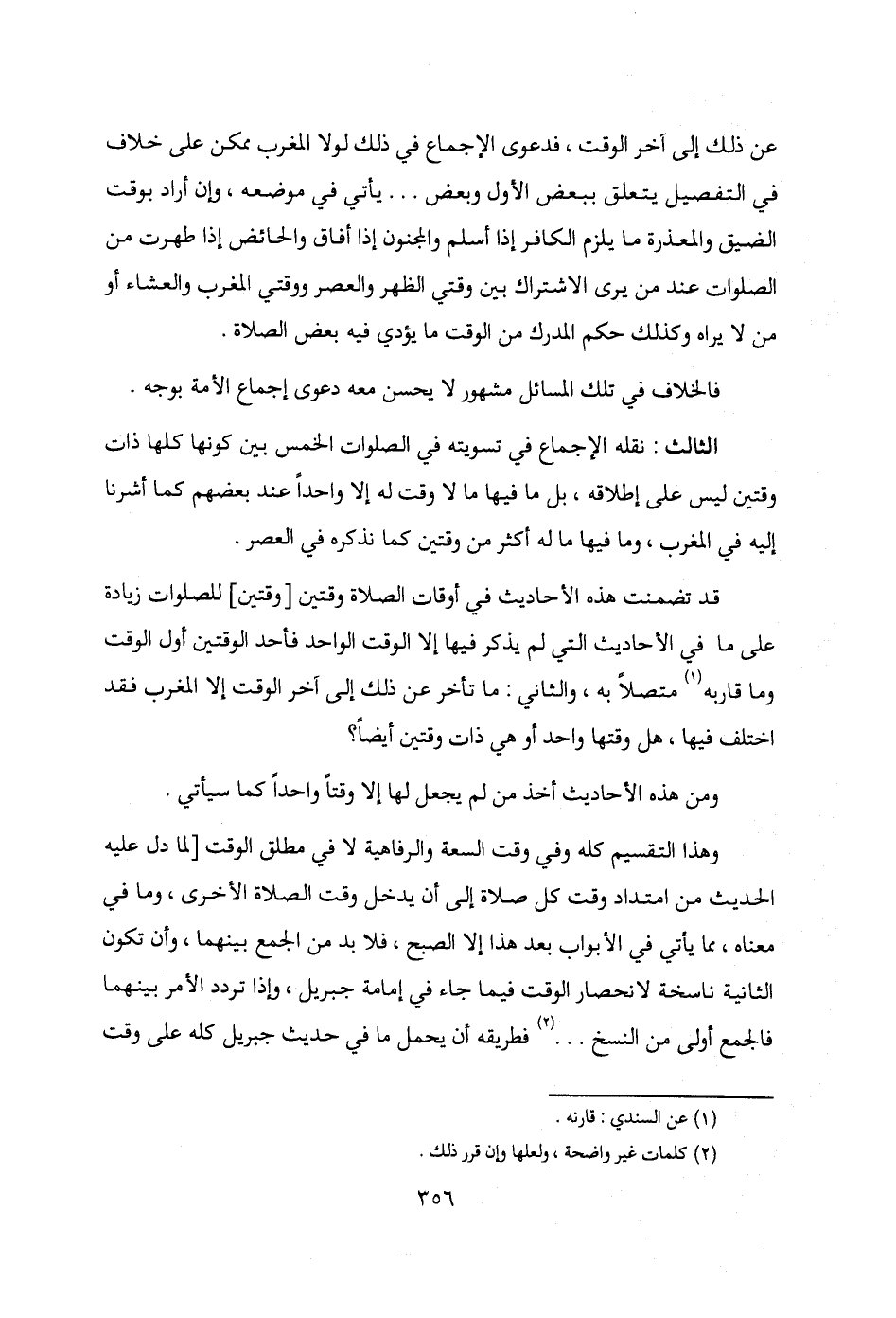 الثالث: نقله الإجماع في تسويته في الصلوات الخمس بين كونها كلها ذات وقتين ليس على إطلاقه، بل ما فيها ما لا وقت له إلا واحدًا عند بعضهم كما أشرنا إليه في المغرب، وما فيها ما له أكثر من وقتين كما نذكره في العصر.